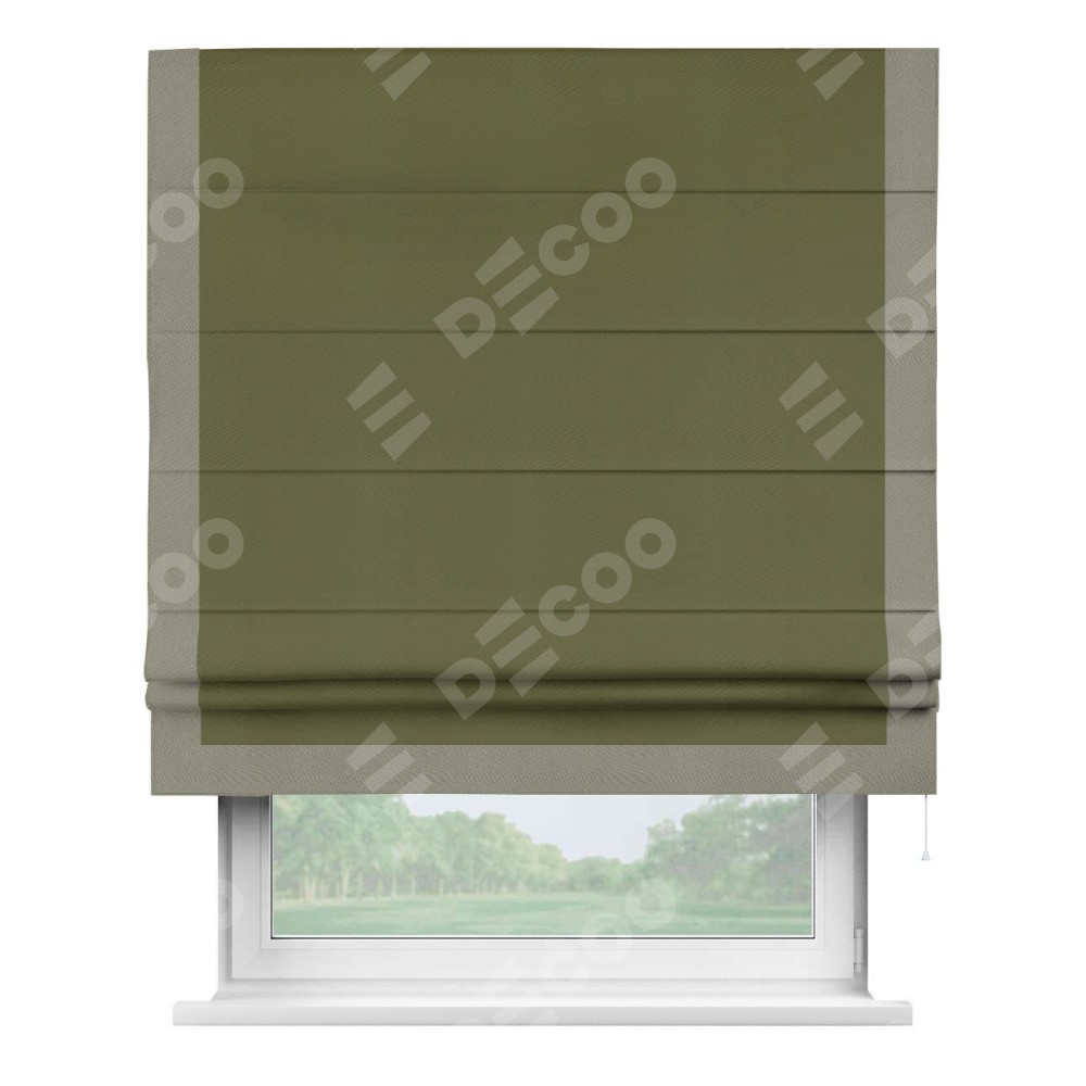 Римская штора производителя «Cortin», используется для проёма, пошита из ткани блэкаут однотонный зелёный, артикул ткани 81859. Отделка шторы кантом «Виктория», ткань для канта используется из блэкаута однотонного разной расцветки на выбор. Имеет универсальный механизм и подходит для монтажа: на потолок, на стену и в нишу.