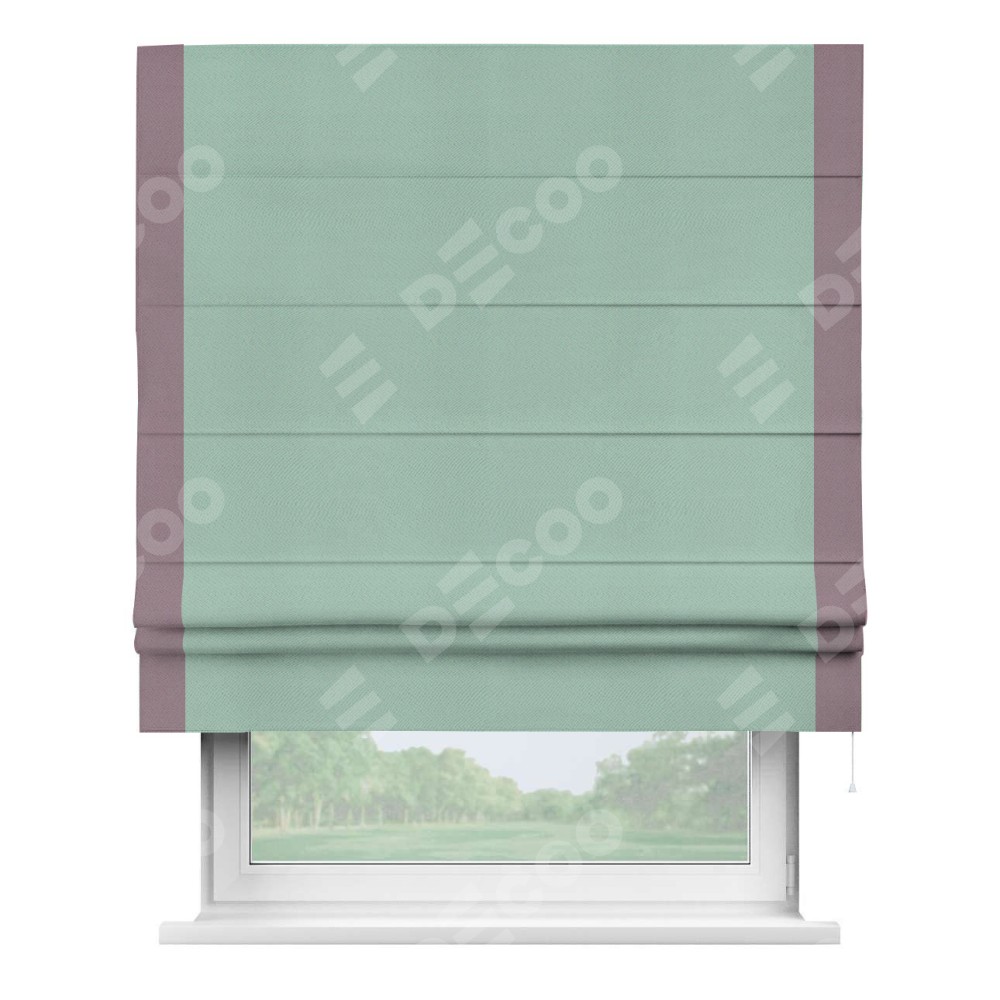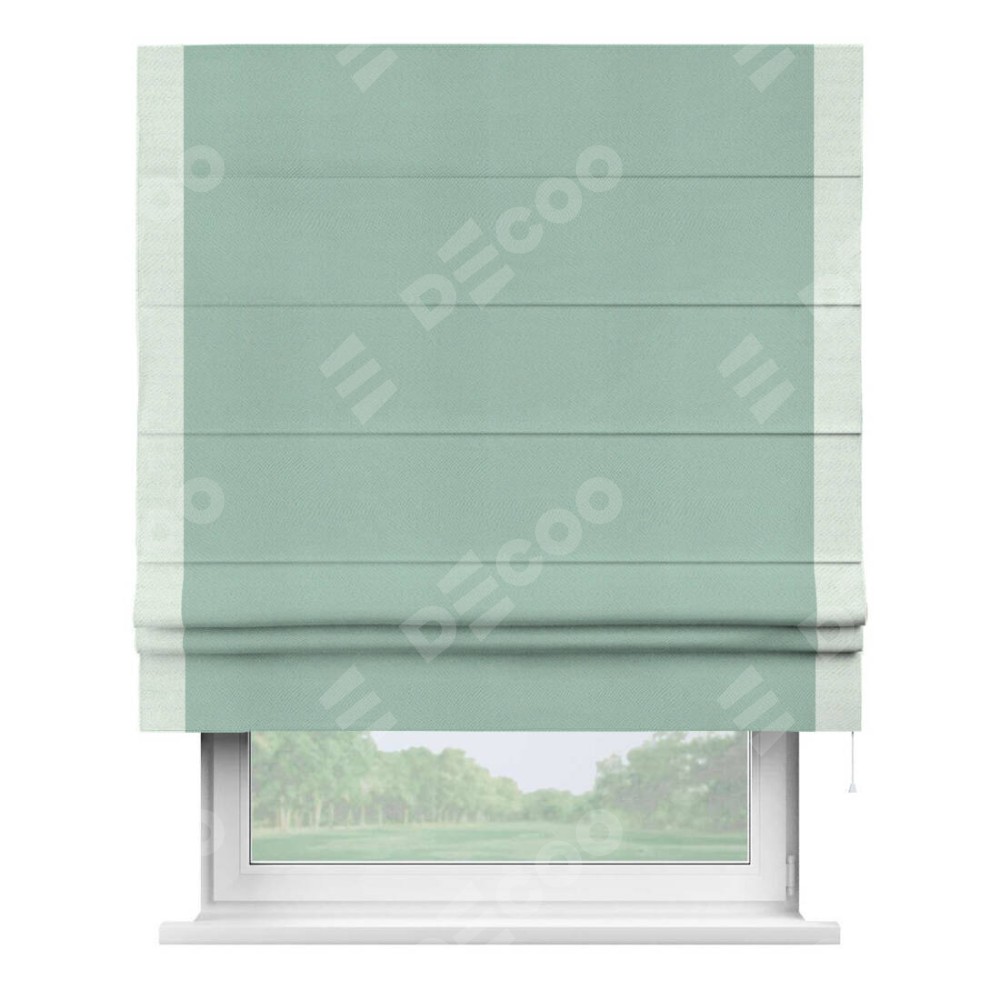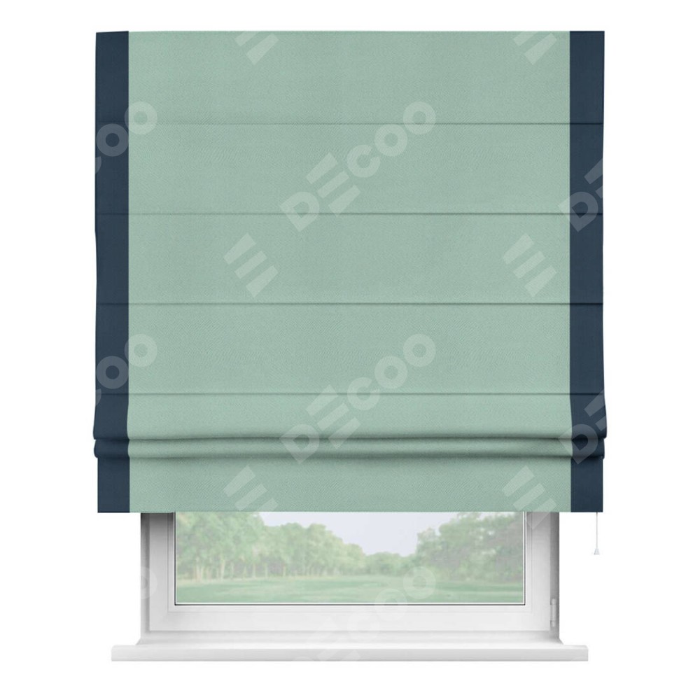 Римская штора производителя «Cortin», используется для проёма, пошита из ткани блэкаут однотонный ментоловый, артикул ткани 29584. Отделка шторы кантом «Стрим Дуо», ткань для канта используется из блэкаута однотонного разной расцветки на выбор. Имеет универсальный механизм и подходит для монтажа: на потолок, на стену и в нишу.