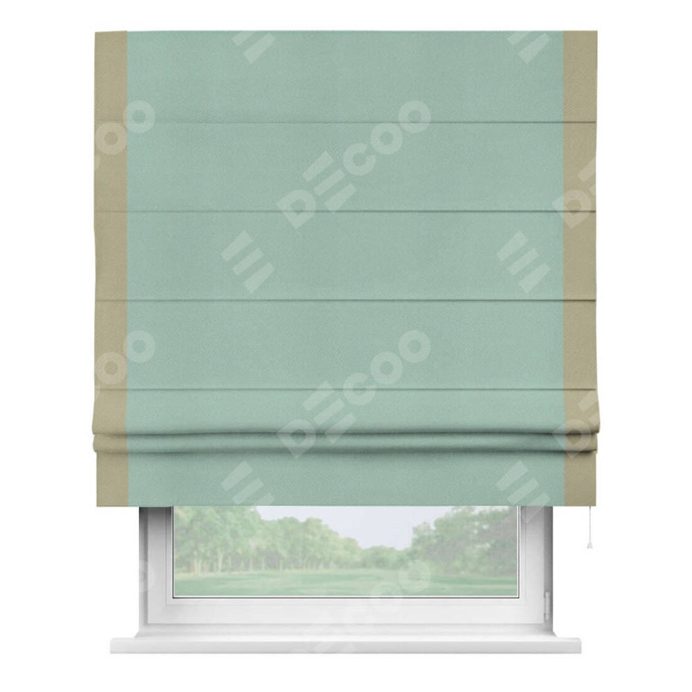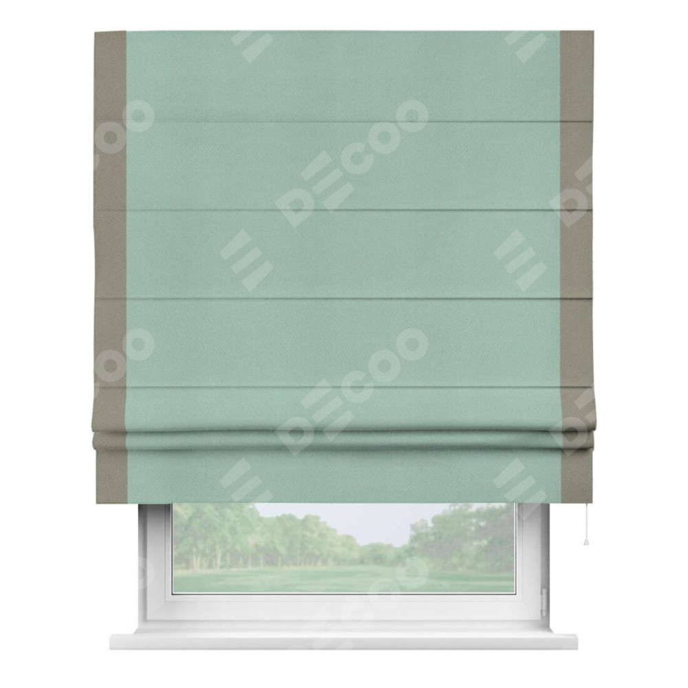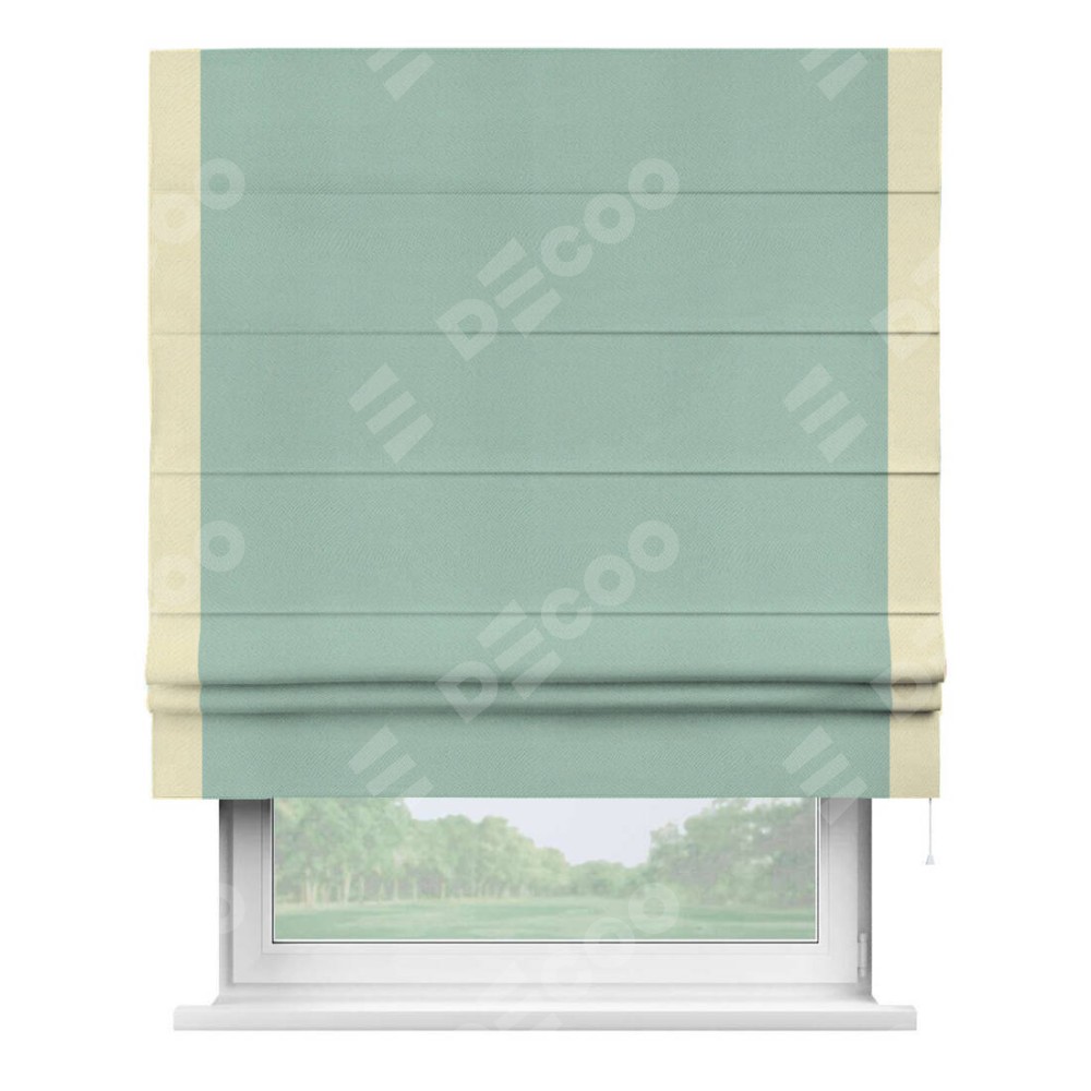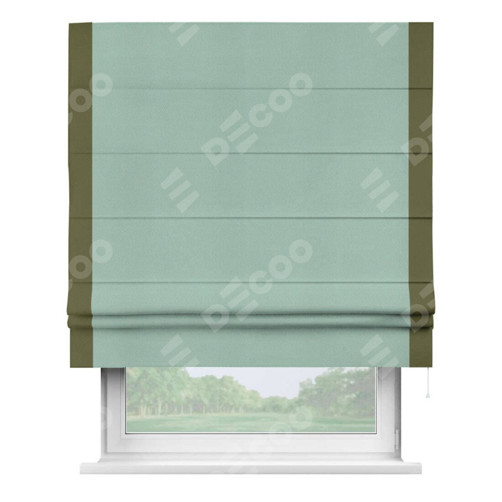 Римская штора производителя «Cortin», используется для проёма, пошита из ткани блэкаут однотонный ментоловый, артикул ткани 29584. Отделка шторы кантом «Стрим Дуо», ткань для канта используется из блэкаута однотонного разной расцветки на выбор. Имеет универсальный механизм и подходит для монтажа: на потолок, на стену и в нишу.