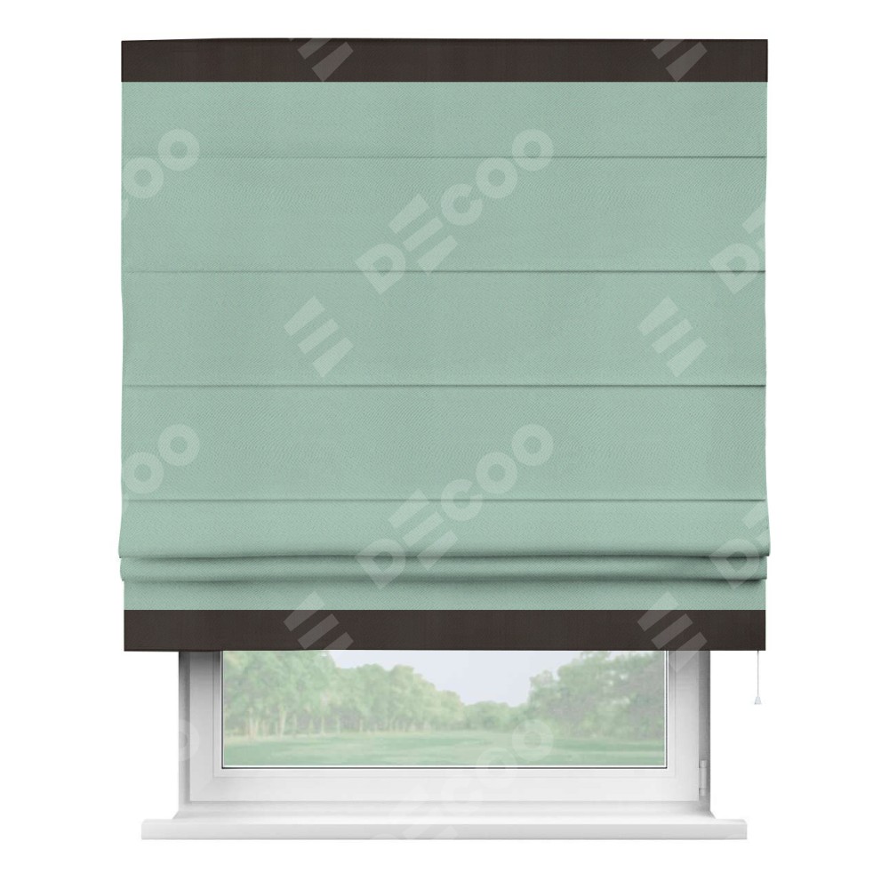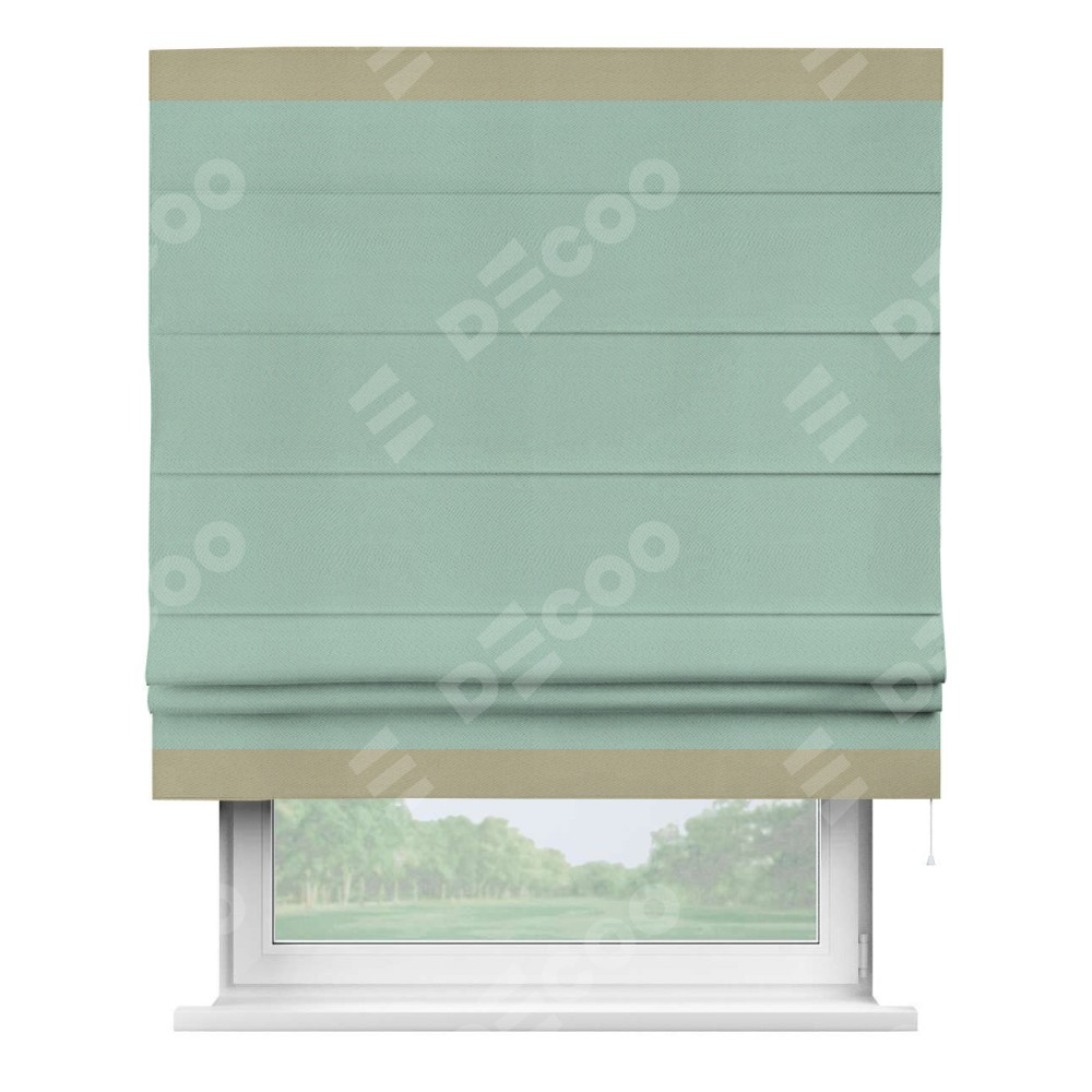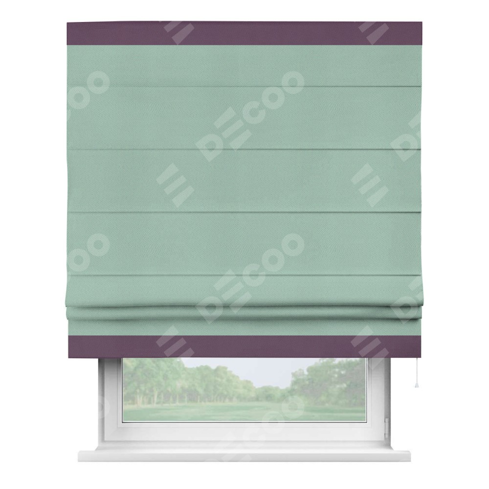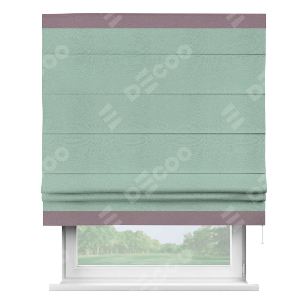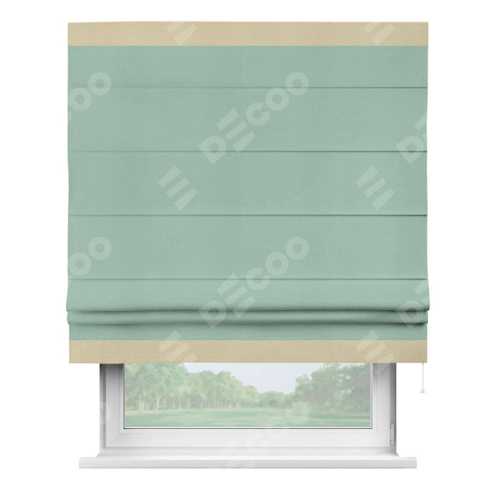 Римская штора производителя «Cortin», используется для проёма, пошита из ткани блэкаут однотонный ментоловый, артикул ткани 29584. Отделка шторы кантом «Горизонт», ткань для канта используется из блэкаута однотонного разной расцветки на выбор. Имеет универсальный механизм и подходит для монтажа: на потолок, на стену и в нишу.