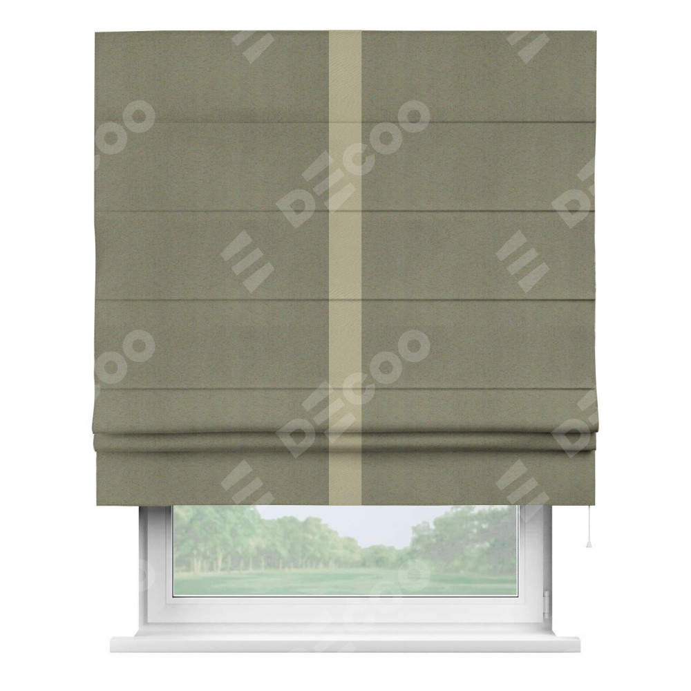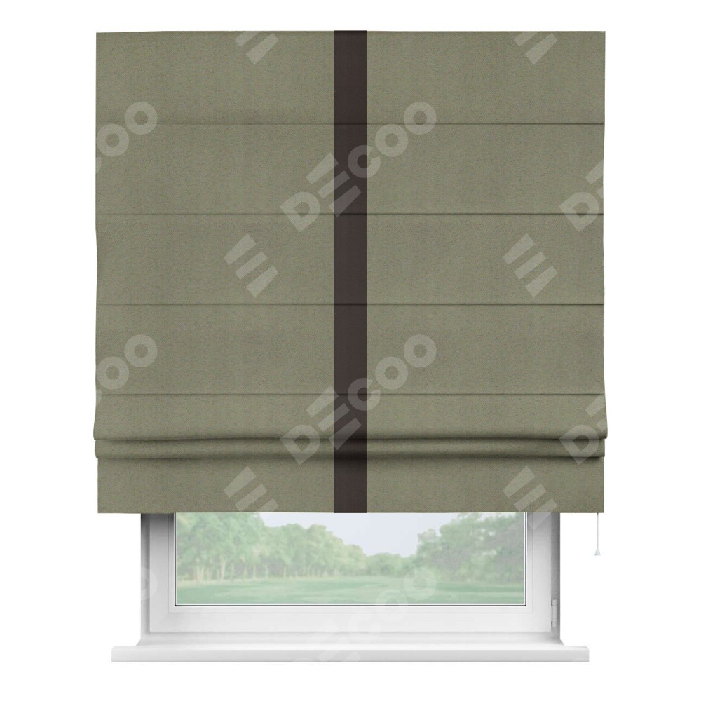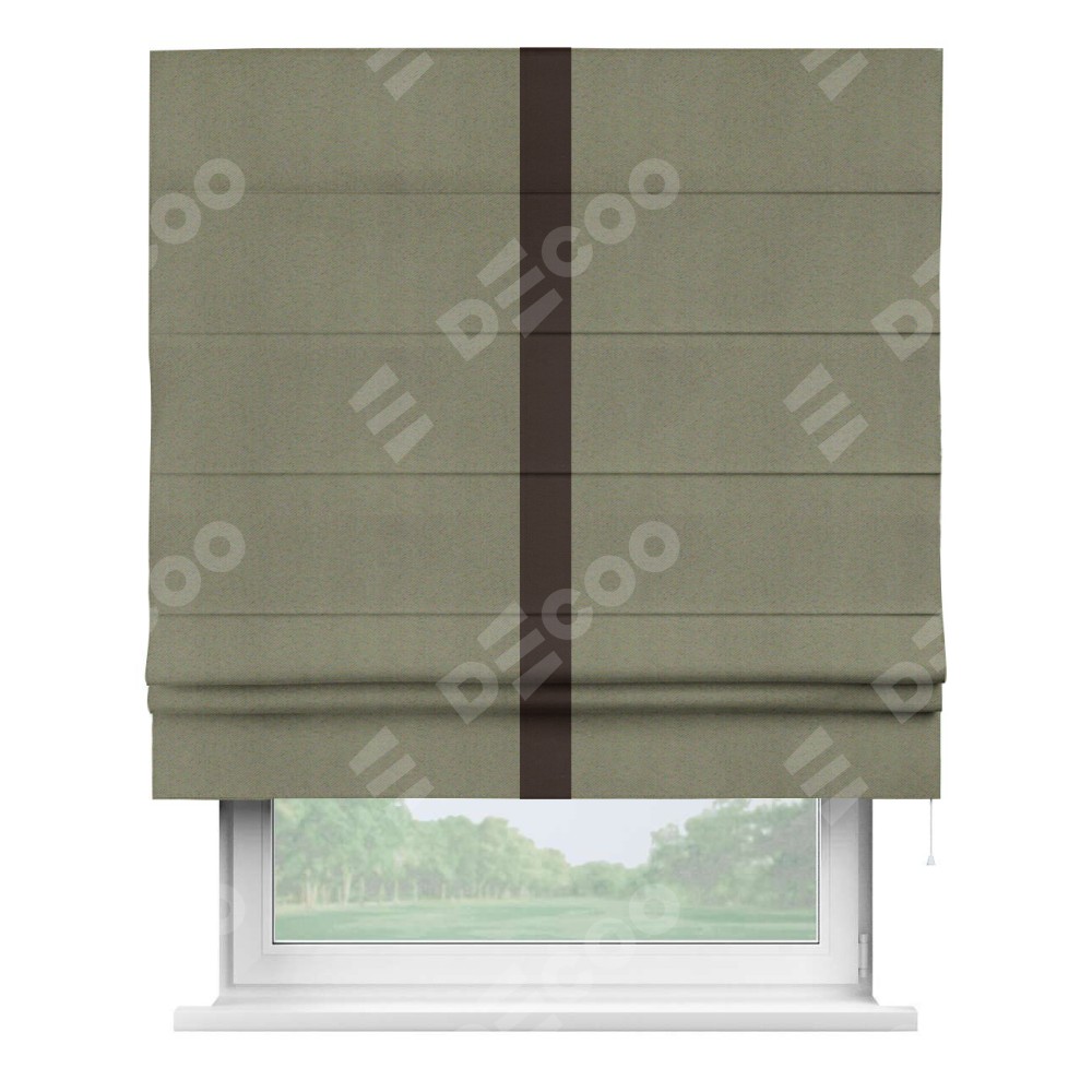 Римская штора производителя «Cortin», используется для проёма, пошита из ткани блэкаут однотонный серо-коричневый, артикул ткани 29568. Отделка шторы кантом «Хайвей», ткань для канта используется из блэкаута однотонного разной расцветки на выбор. Имеет универсальный механизм и подходит для монтажа: на потолок, на стену и в нишу.