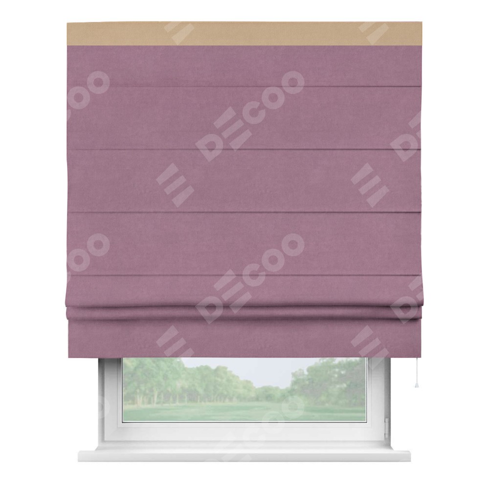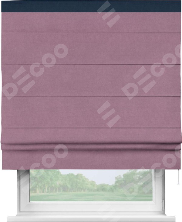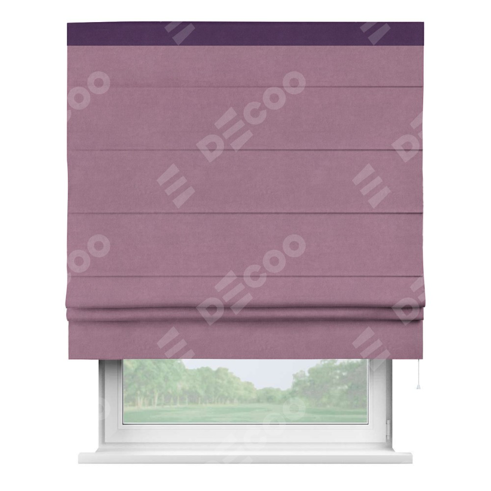 Римская штора производителя «Cortin», используется для проёма, пошита из ткани вельвет лиловый, артикул ткани 17752. Отделка шторы кантом «Кинг», ткань для канта используется из вельвета разной расцветки на выбор. Имеет универсальный механизм и подходит для монтажа: на потолок, на стену и в нишу.