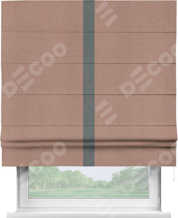 Римская штора производителя «Cortin», используется для проёма, пошита из ткани вельвет брусничный джем, артикул ткани 17750. Отделка шторы кантом «Хайвей», ткань для канта используется из вельвета разной расцветки на выбор. Имеет универсальный механизм и подходит для монтажа: на потолок, на стену и в нишу.