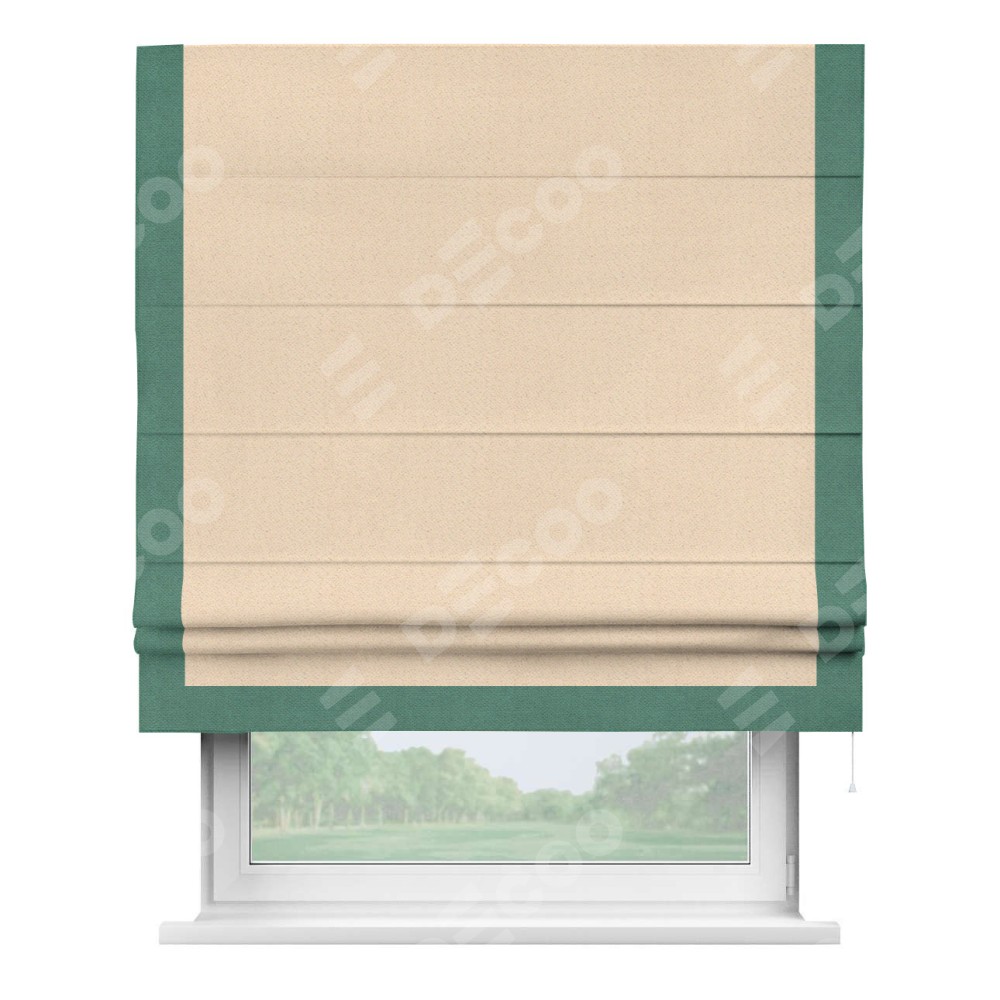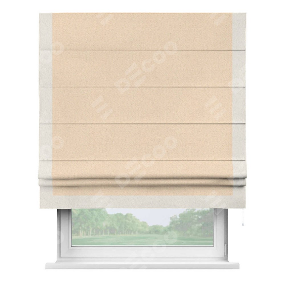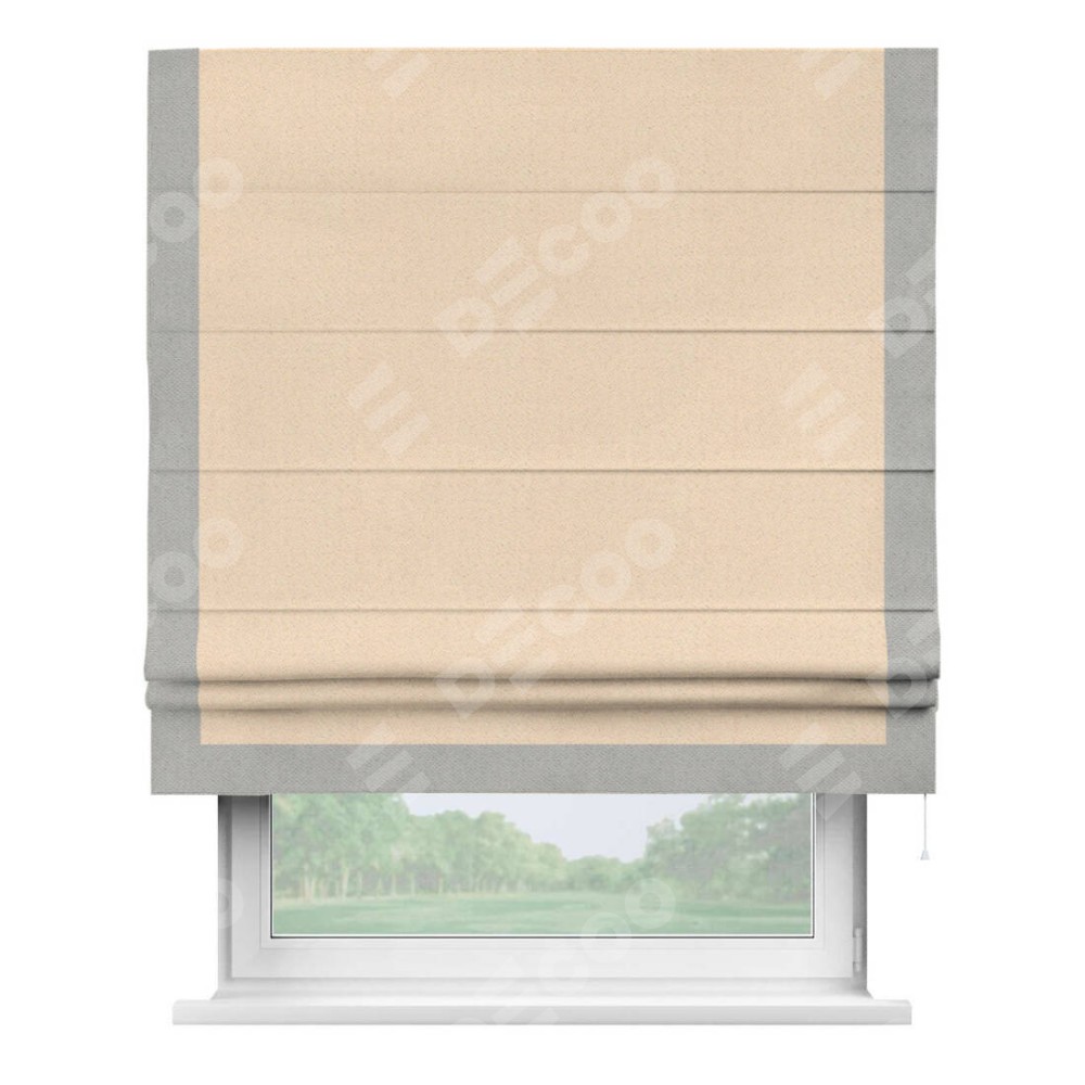 Римская штора производителя «Cortin», используется для проёма, пошита из ткани блэкаут с блеском бежевый, артикул 34627. Отделка шторы кантом «Виктория», ткань для канта используется из блэкаута с блеском разной расцветки на выбор. Изнаночная сторона материала черного цвета, что обеспечивает необходимую светонепроницаемость. Имеет универсальный механизм и подходит для монтажа: на потолок, на стену и в нишу.