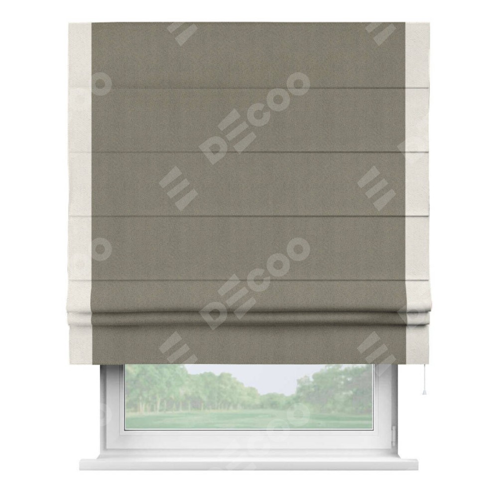 Римская штора производителя «Cortin», используется для проёма, пошита из ткани блэкаут с блеском графитовый, артикул 34648. Отделка шторы кантом «Стрим Дуо», ткань для канта используется из блэкаута с блеском разной расцветки на выбор. Изнаночная сторона материала черного цвета, что обеспечивает необходимую светонепроницаемость. Имеет универсальный механизм и подходит для монтажа: на потолок, на стену и в нишу.