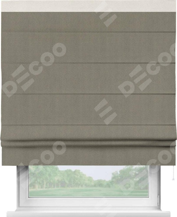Римская штора производителя «Cortin», используется для проёма, пошита из ткани блэкаут с блеском графитовый, артикул 34648. Отделка шторы кантом «Кинг», ткань для канта используется из блэкаута с блеском разной расцветки на выбор. Изнаночная сторона материала черного цвета, что обеспечивает необходимую светонепроницаемость. Имеет универсальный механизм и подходит для монтажа: на потолок, на стену и в нишу.