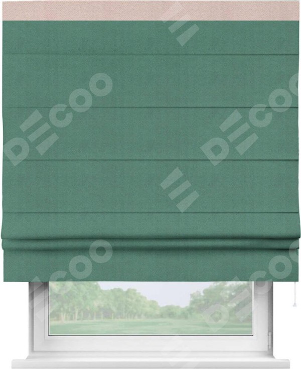Римская штора производителя «Cortin», используется для проёма, пошита из ткани блэкаут с блеском изумрудный, артикул 34628. Отделка шторы кантом «Кинг», ткань для канта используется из блэкаута с блеском разной расцветки на выбор. Изнаночная сторона материала черного цвета, что обеспечивает необходимую светонепроницаемость. Имеет универсальный механизм и подходит для монтажа: на потолок, на стену и в нишу.