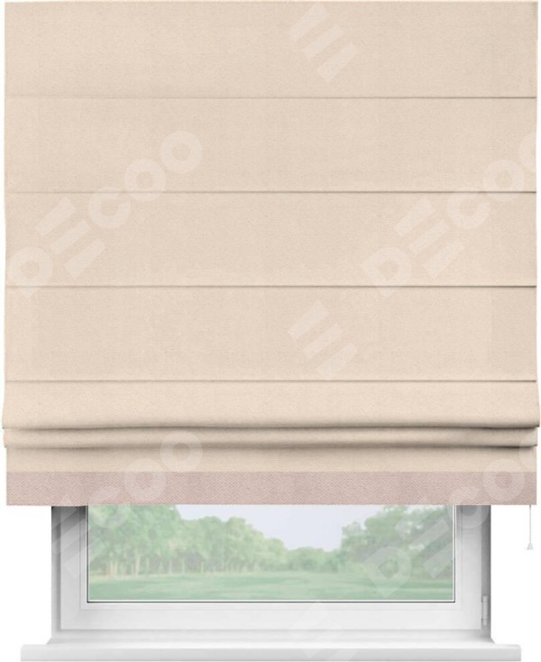 Римская штора производителя «Cortin», используется для проёма, пошита из ткани блэкаут с блеском розовая пудра, артикул 34632. Отделка шторы кантом «Джестер», ткань для канта используется из блэкаута с блеском разной расцветки на выбор. Изнаночная сторона материала черного цвета, что обеспечивает необходимую светонепроницаемость. Имеет универсальный механизм и подходит для монтажа: на потолок, на стену и в нишу.