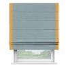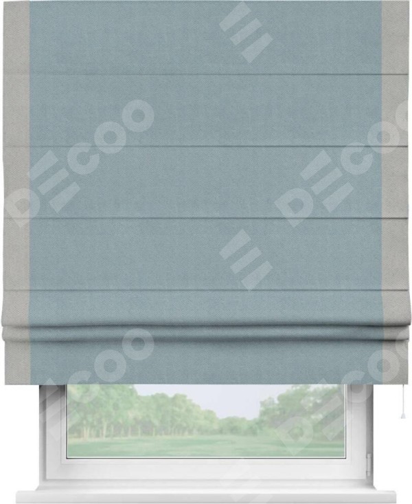 Римская штора производителя «Cortin», используется для проёма, пошита из ткани блэкаут с блеском синий, артикул 34625. Отделка шторы кантом «Стрим Дуо», ткань для канта используется из блэкаута с блеском разной расцветки на выбор. Изнаночная сторона материала черного цвета, что обеспечивает необходимую светонепроницаемость. Имеет универсальный механизм и подходит для монтажа: на потолок, на стену и в нишу.