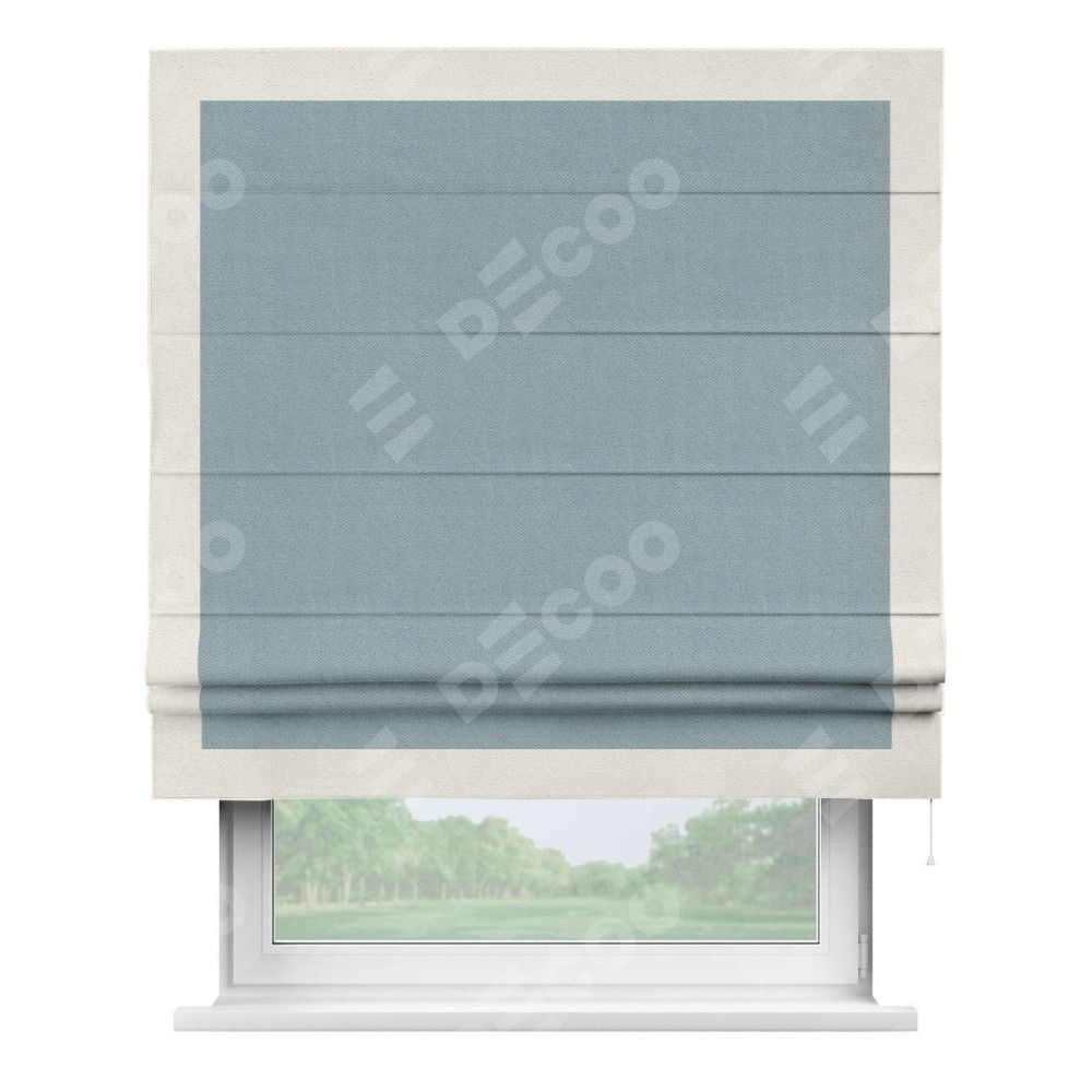 Римская штора производителя «Cortin», используется для проёма, пошита из ткани блэкаут с блеском синий, артикул 34625. Отделка шторы кантом «Чесс», ткань для канта используется из блэкаута с блеском разной расцветки на выбор. Изнаночная сторона материала черного цвета, что обеспечивает необходимую светонепроницаемость. Имеет универсальный механизм и подходит для монтажа: на потолок, на стену и в нишу.