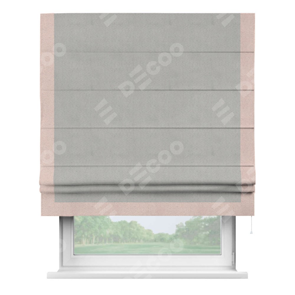 Римская штора производителя «Cortin», используется для проёма, пошита из ткани блэкаут с блеском тёмно-серый, артикул 34634. Отделка шторы кантом «Виктория», ткань для канта используется из блэкаута с блеском разной расцветки на выбор. Изнаночная сторона материала черного цвета, что обеспечивает необходимую светонепроницаемость. Имеет универсальный механизм и подходит для монтажа: на потолок, на стену и в нишу.