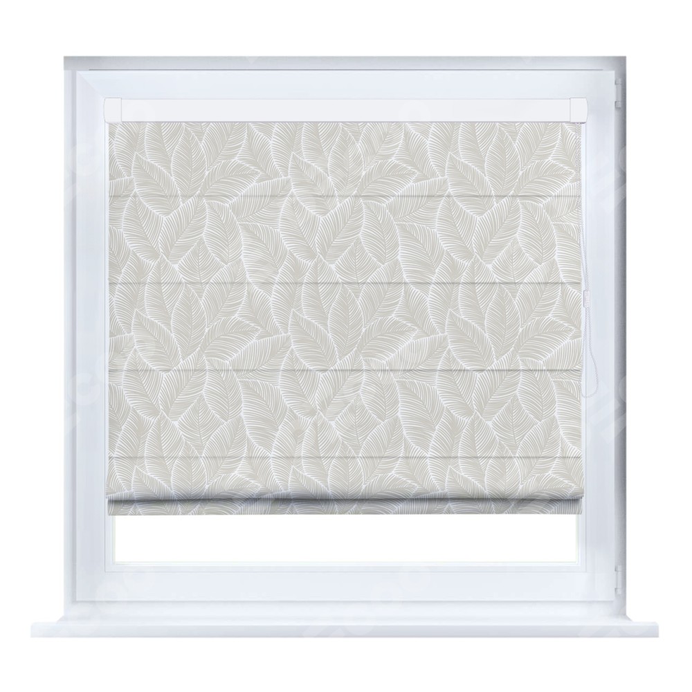 Римская штора производителя «Cortin», устанавливается на створку окна, пошита из ткани блэкаут с нанесением сублимационной печати «Бежевые листья». Штора шьётся по индивидуальным размерам, для данного типа римской шторы возможная ширина от 35 до 150 см., высота до 250 см.