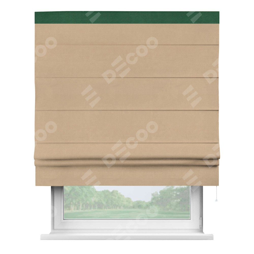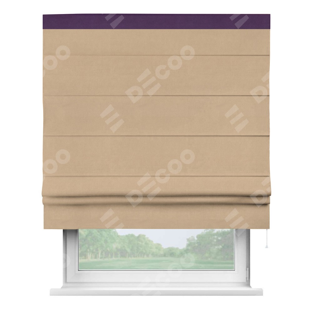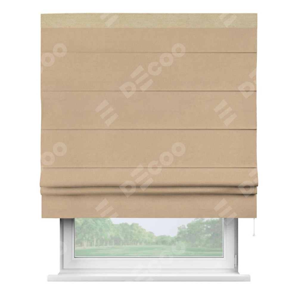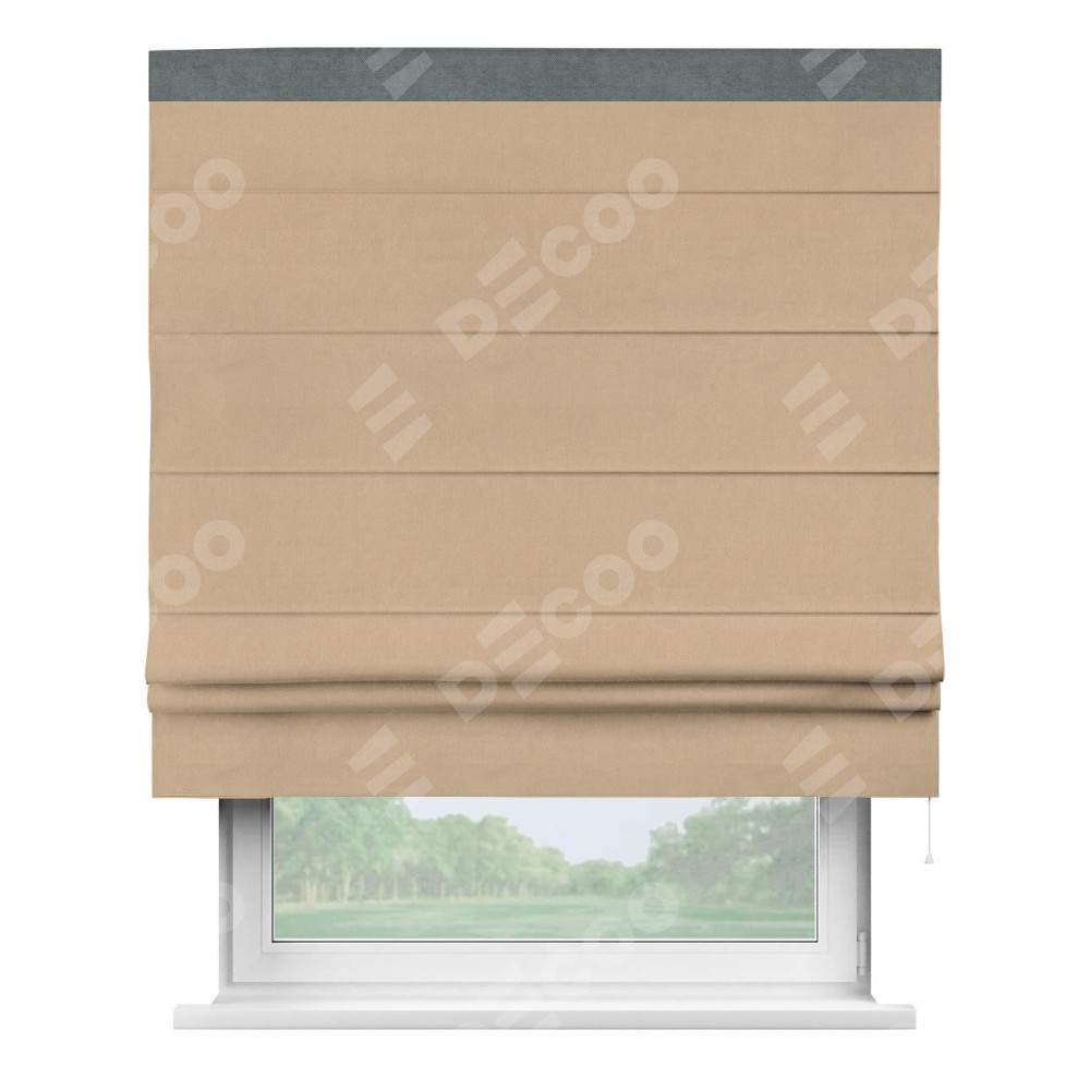Римская штора производителя «Cortin», используется для проёма, пошита из ткани вельвет песочный, артикул ткани 17740. Отделка шторы кантом «Кинг», ткань для канта используется из вельвета разной расцветки на выбор. Имеет универсальный механизм и подходит для монтажа: на потолок, на стену и в нишу.