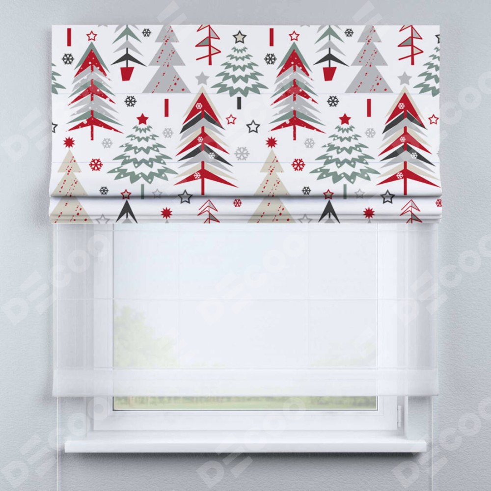 Римская штора день-ночь производителя «Cortin», используется для проёма, пошита из двух полотен, с лицевой блэкаут с нанесением сублимационной печати «Волшебство зимы», вторая ткань тюль (по стандарту комплектуется тюль белого цвета артикул V-01). Имеет универсальный механизм и подходит для монтажа: на потолок, на стену и в нишу.