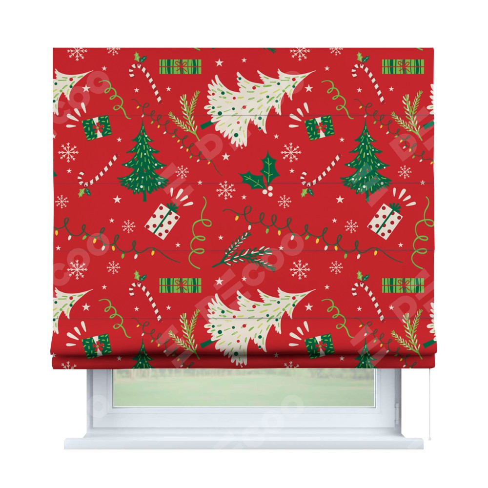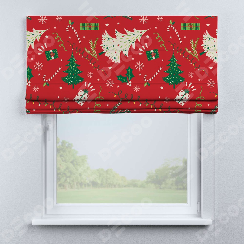 Римская штора производителя «Cortin», используется для проёма, пошита из ткани блэкаут с нанесением сублимационной печати «Новогодние подарки». Имеет универсальный механизм и подходит для монтажа: на потолок, на стену и в нишу.
