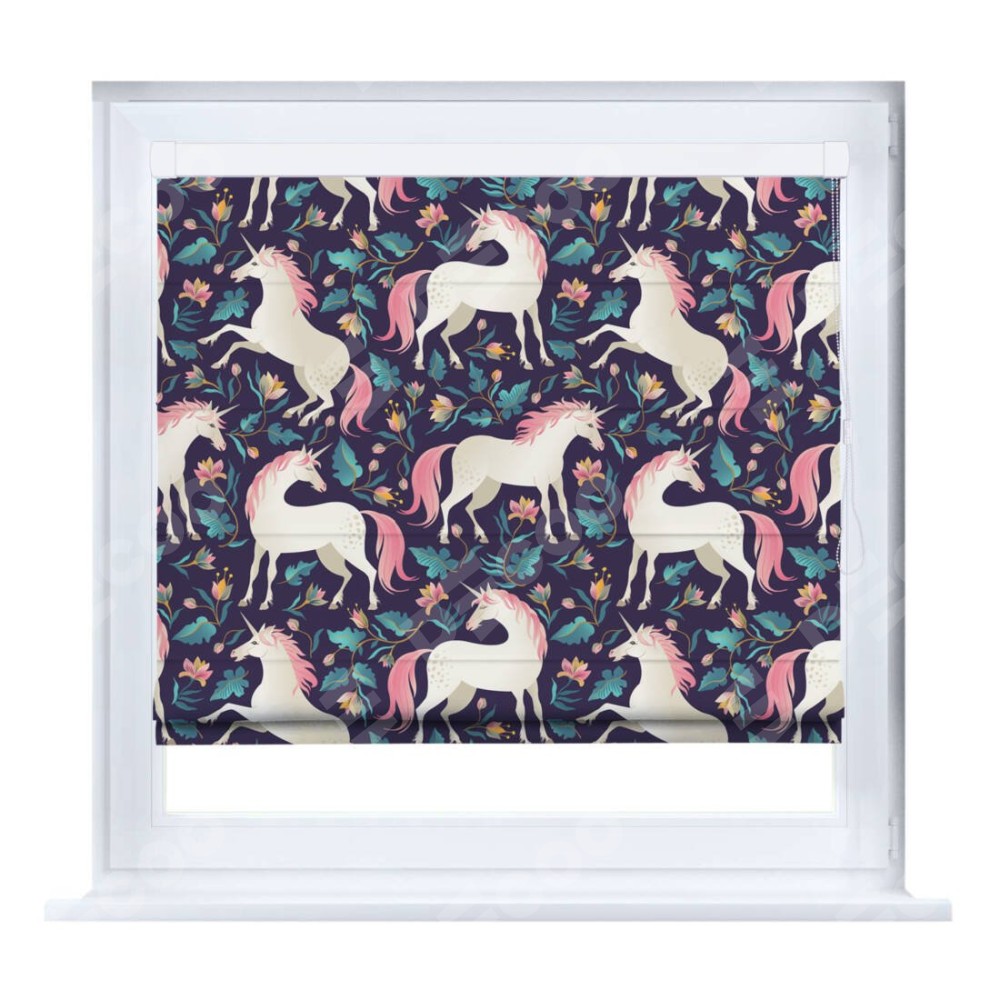 Римская штора производителя «Cortin», устанавливается на створку окна, пошита из ткани блэкаут с нанесением сублимационной печати «Сказочные единороги». Штора шьётся по индивидуальным размерам, для данного типа римской шторы возможная ширина от 35 до 150 см., высота до 250 см.