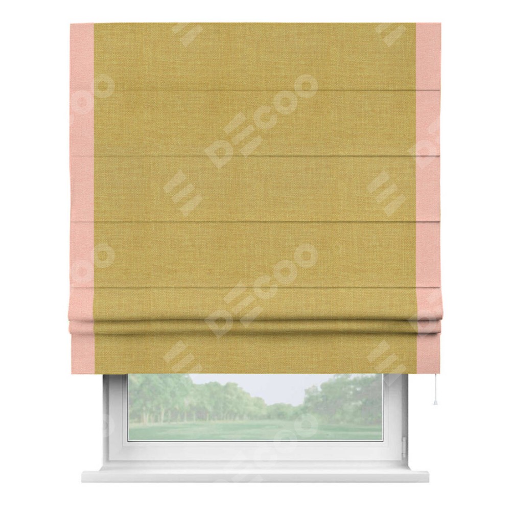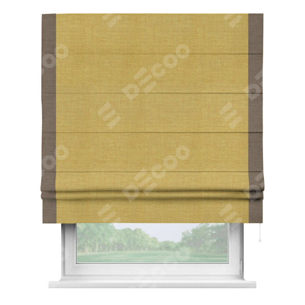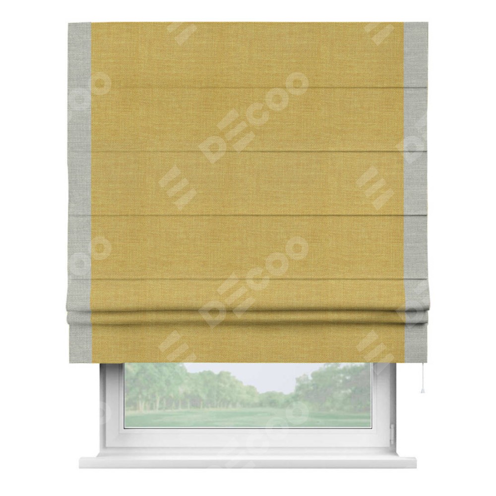 Римская штора производителя «Cortin», используется для проёма, пошита из ткани лён горчичный, артикул 74740. Отделка шторы кантом «Стрим Дуо», ткань для канта используется из льна разной расцветки на выбор. Имеет универсальный механизм и подходит для монтажа: на потолок, на стену и в нишу.
