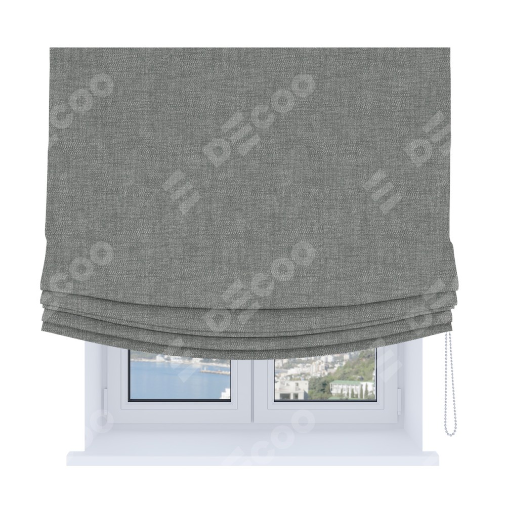 Римская штора Soft производителя «Cortin», используется для проёма, пошита из ткани рогожка димаут тёмно-серый, артикул ткани 80418. Имеет универсальный механизм и подходит для монтажа: на потолок, на стену и в нишу. В отличие от стандартных римских штор, римская штора Soft не имеет горизонтальных вставок и нижнего отвеса. Это позволяет ткани произвольно драпироваться в свободные мягкие складки.