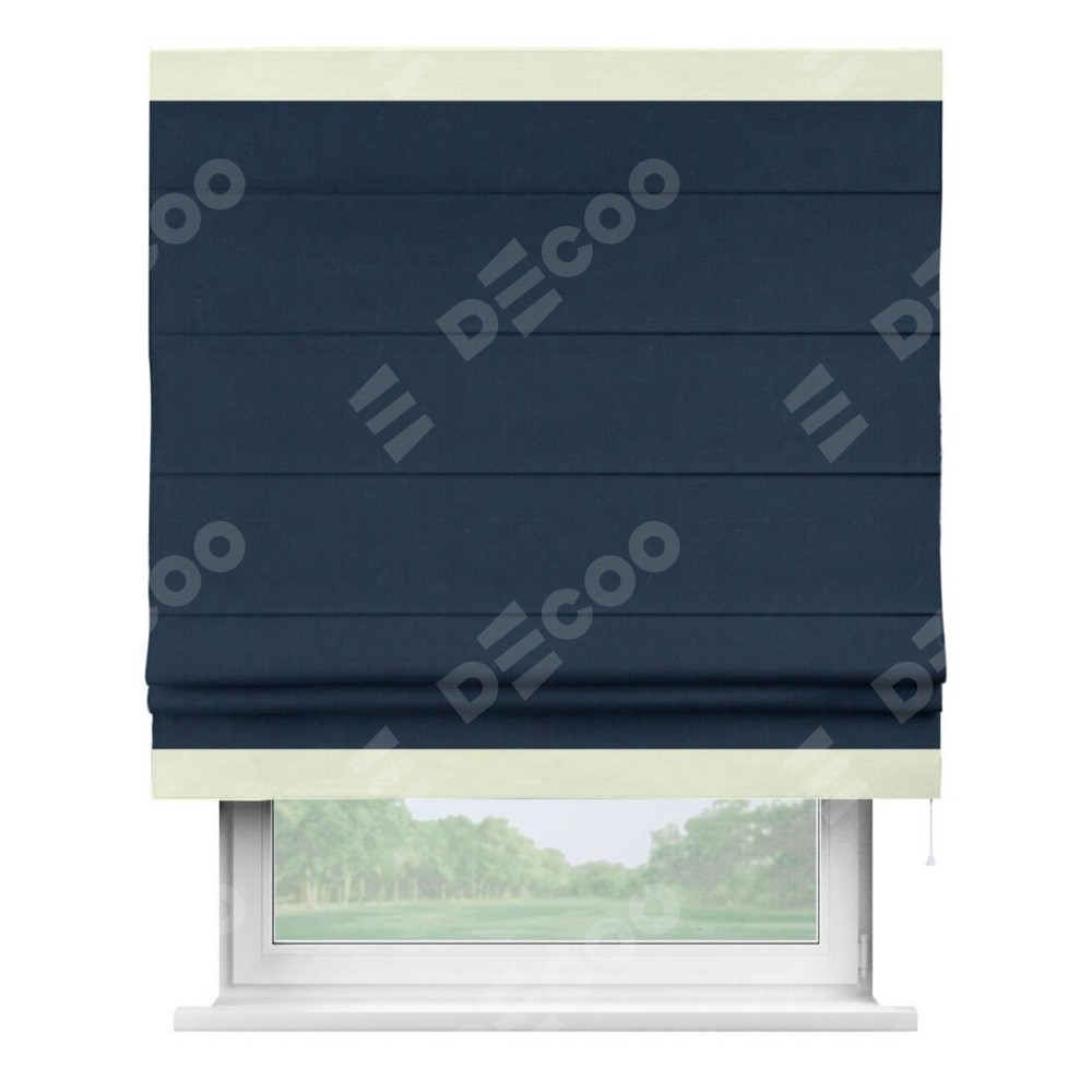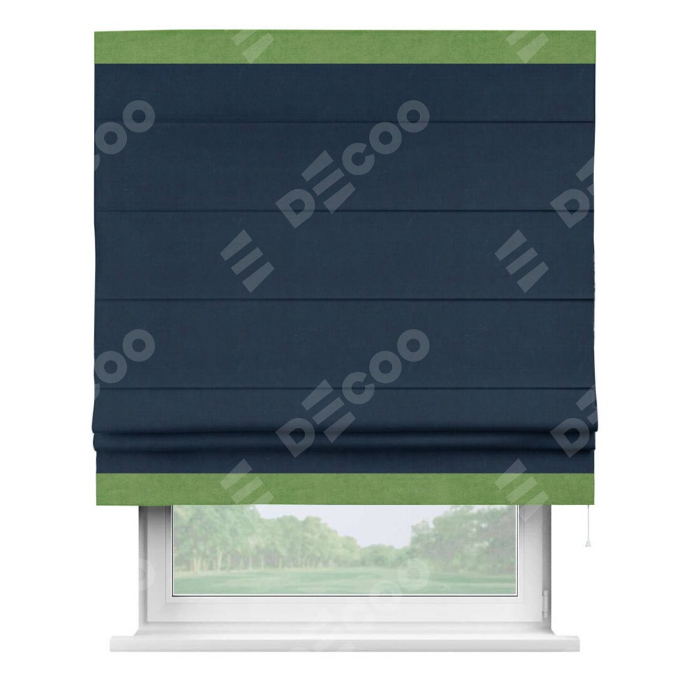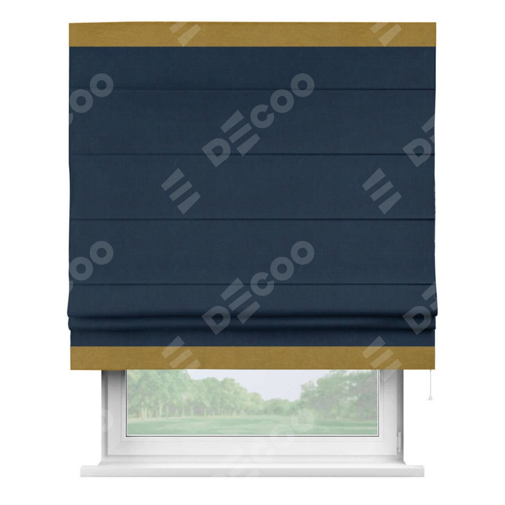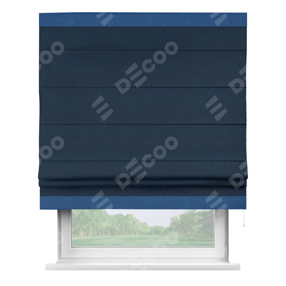 Римская штора производителя «Cortin», используется для проёма, пошита из ткани вельвет темно-синий, артикул ткани 14152. Отделка шторы кантом «Горизонт», ткань для канта используется из вельвета разной расцветки на выбор. Имеет универсальный механизм и подходит для монтажа: на потолок, на стену и в нишу.