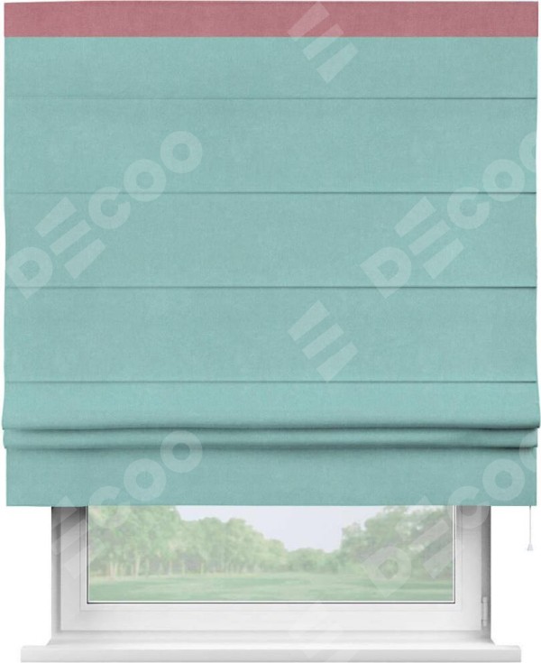 Римская штора производителя «Cortin», используется для проёма, пошита из ткани вельвет тиффани, артикул ткани 17765. Отделка шторы кантом «Кинг», ткань для канта используется из вельвета разной расцветки на выбор. Имеет универсальный механизм и подходит для монтажа: на потолок, на стену и в нишу.