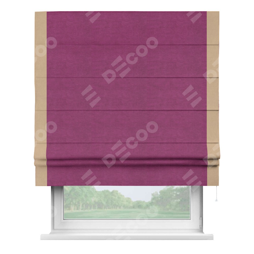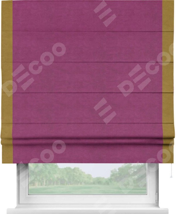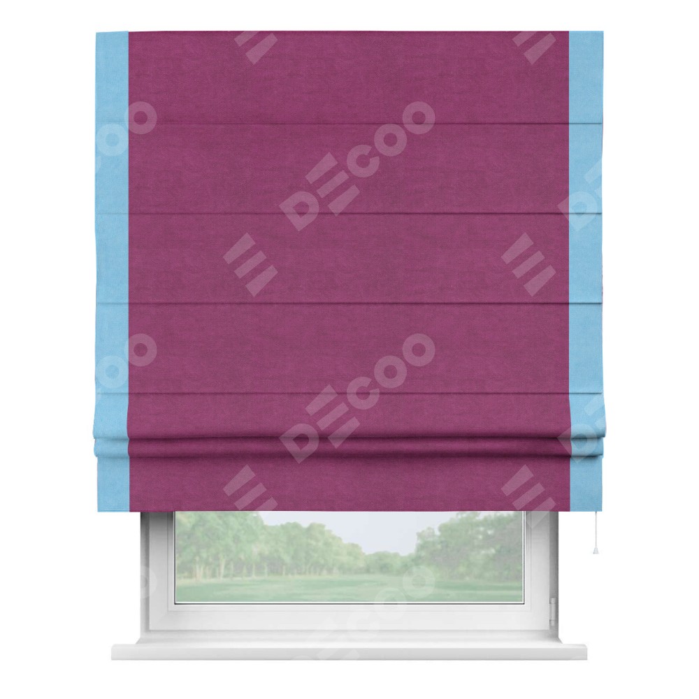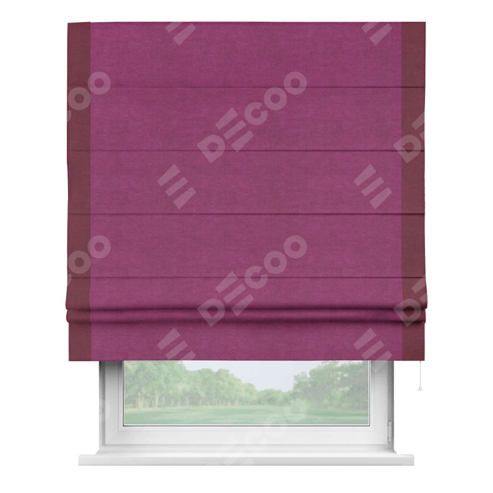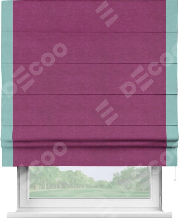 Римская штора производителя «Cortin», используется для проёма, пошита из ткани вельвет фиолетовый, артикул ткани 85552. Отделка шторы кантом «Стрим Дуо», ткань для канта используется из вельвета разной расцветки на выбор. Имеет универсальный механизм и подходит для монтажа: на потолок, на стену и в нишу.