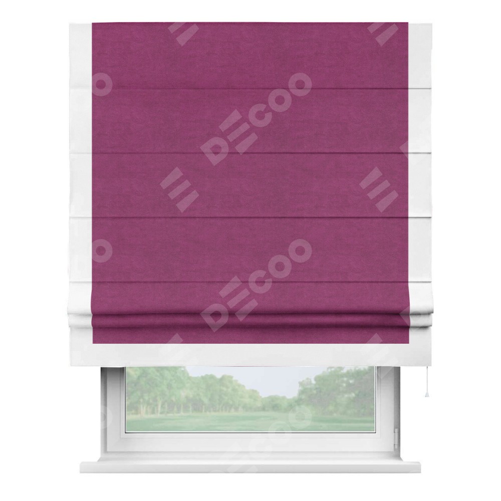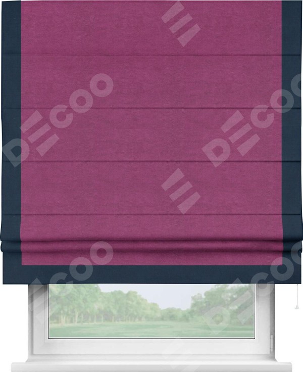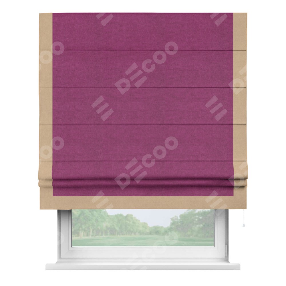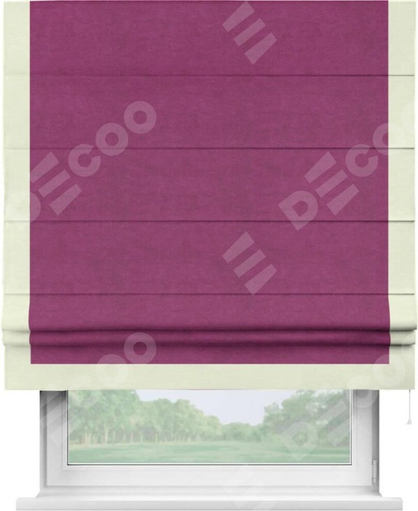 Римская штора производителя «Cortin», используется для проёма, пошита из ткани вельвет фиолетовый, артикул ткани 85552. Отделка шторы кантом «Виктория», ткань для канта используется из вельвета разной расцветки на выбор. Имеет универсальный механизм и подходит для монтажа: на потолок, на стену и в нишу.