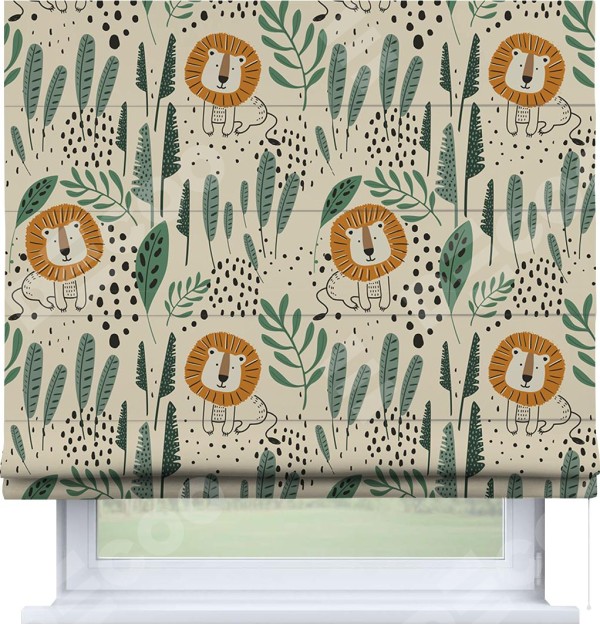 Римская штора производителя «Cortin», используется для проёма, пошита из ткани блэкаут с нанесением сублимационной печати «Лев из джунглей». Имеет универсальный механизм и подходит для монтажа: на потолок, на стену и в нишу.
