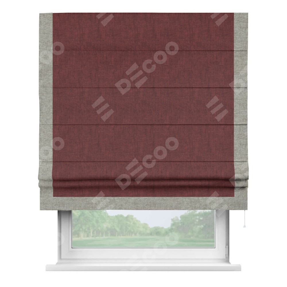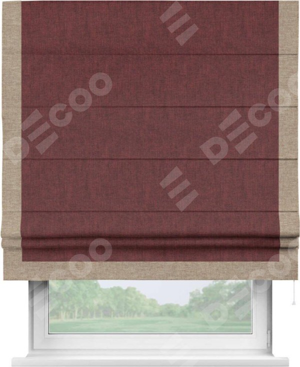 Римская штора производителя «Cortin», используется для проёма, пошита из ткани лён кашемир бордовый, артикул 17213. Отделка шторы кантом «Виктория», ткань для канта используется из льна разной расцветки на выбор. Имеет универсальный механизм и подходит для монтажа: на потолок, на стену и в нишу.