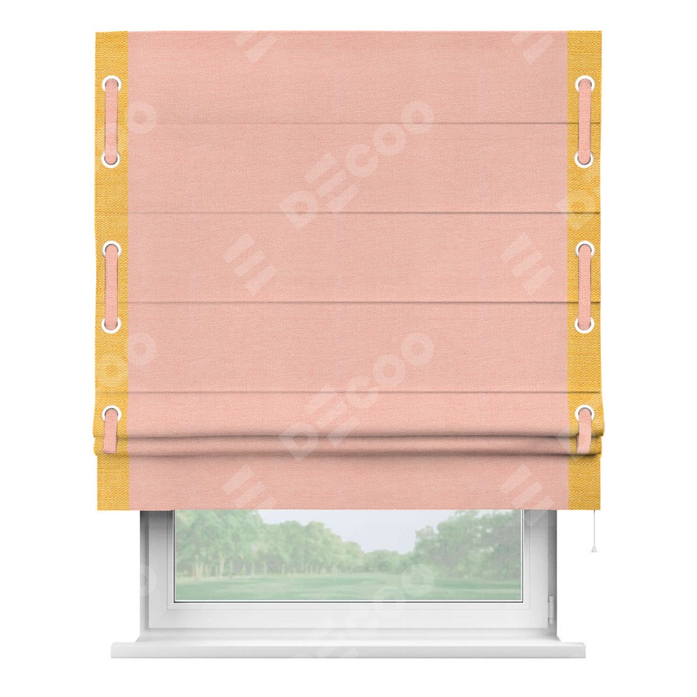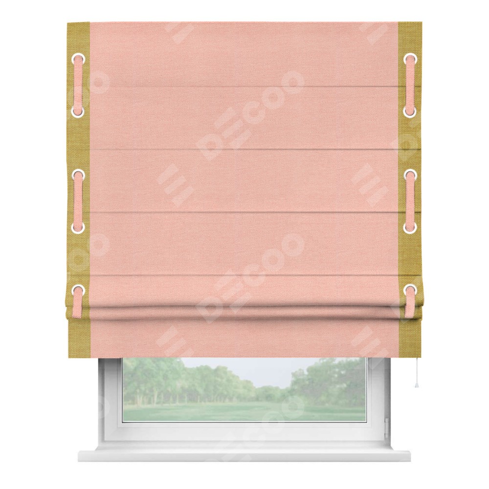 Римская штора производителя «Cortin», используется для проёма, пошита из ткани лён розовый, артикул 00005. Отделка шторы кантом «Стрим Дуо» на кантах расположены люверсы с пояском, ткань для канта используется из льна разной расцветки на выбор. Ткань для пояска обычно используется из основной ткани шторы, а так же можно сделать из любой расцветки по желанию. Имеет универсальный механизм и подходит для монтажа: на потолок, на стену и в нишу.