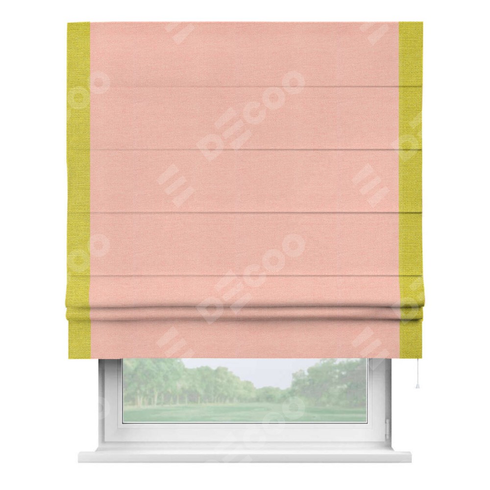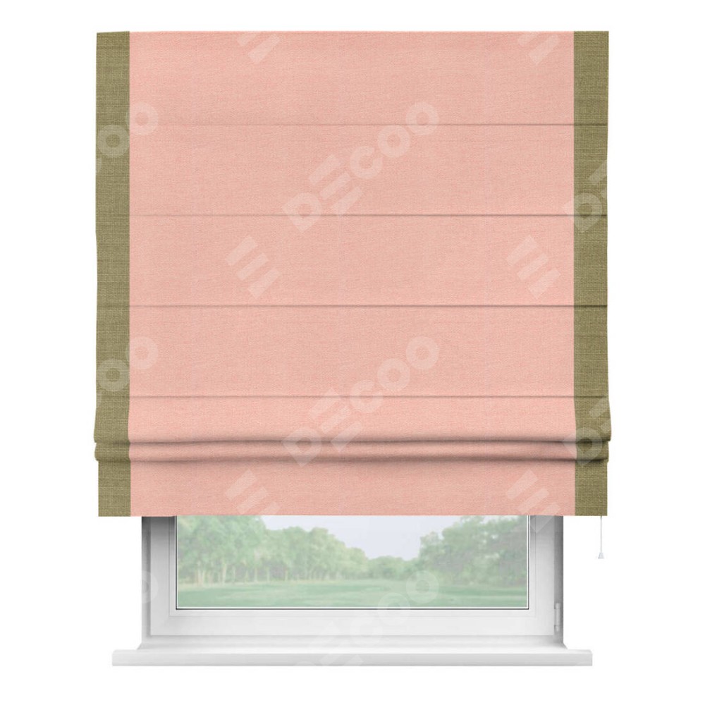 Римская штора производителя «Cortin», используется для проёма, пошита из ткани лён розовый, артикул 00005. Отделка шторы кантом «Стрим Дуо», ткань для канта используется из льна разной расцветки на выбор. Имеет универсальный механизм и подходит для монтажа: на потолок, на стену и в нишу.