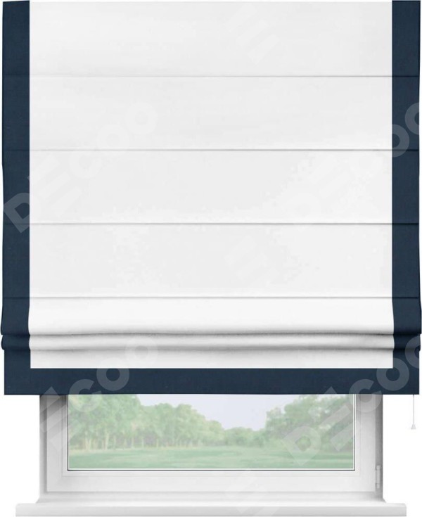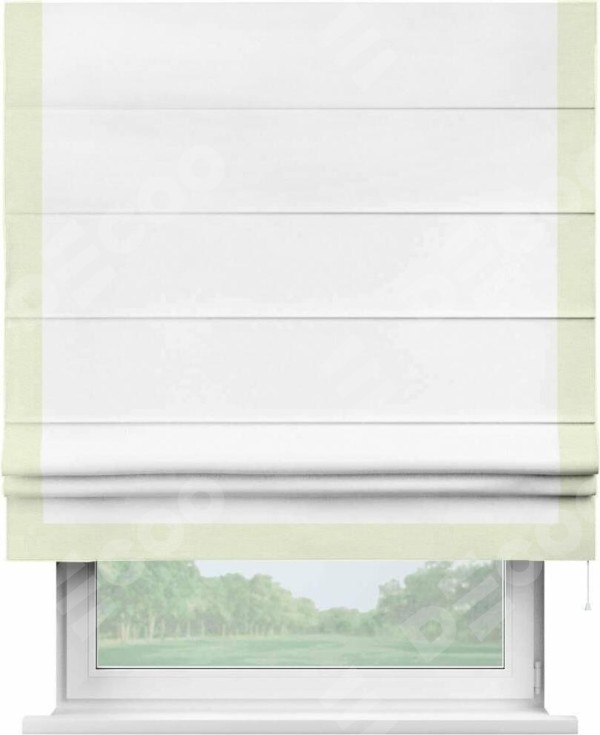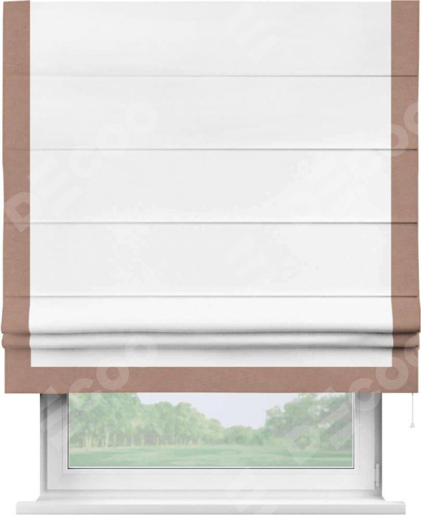 Римская штора производителя «Cortin», используется для проёма, пошита из ткани вельвет белоснежный, артикул ткани 19192. Отделка шторы кантом «Виктория», ткань для канта используется из вельвета разной расцветки на выбор. Имеет универсальный механизм и подходит для монтажа: на потолок, на стену и в нишу.