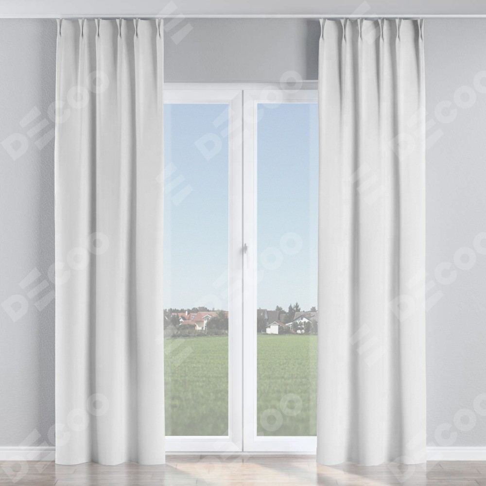 Комплект прямых штор, от производителя «Cortin», пошиты из ткани лён белый, артикул ткани 7439. С изнаночной стороны в верхней части штор пристрачивается шторная лента с декоративными складками «Кустик». Для создания элегантных складок прямые шторы шьются по стандарту с коэффициентом 1:2 (на 100 см. ширины проёма 200 см. ширины ткани).