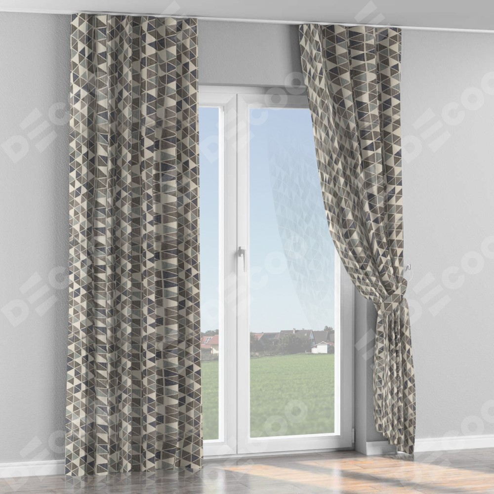 Комплект прямых штор, от производителя «Cortin», пошиты из ткани димаут «Треугольники синие», артикул ткани 23022. С изнаночной стороны в верхней части штор пристрачивается шторная лента с декоративными складками «Волна». Для создания элегантных складок прямые шторы шьются по стандарту с коэффициентом 1:2 (на 100 см. ширины проёма 200 см. ширины ткани).