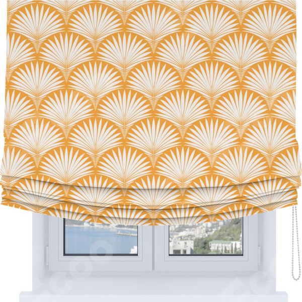 Римская штора Soft производителя «Cortin», используется для проёма, пошита из ткани блэкаут с нанесением сублимационной печати «Арт-деко листья желтый». Имеет универсальный механизм и подходит для монтажа: на потолок, на стену и в нишу. В отличие от стандартных римских штор, римская штора Soft не имеет горизонтальных вставок и нижнего отвеса. Это позволяет ткани произвольно драпироваться в свободные мягкие складки.