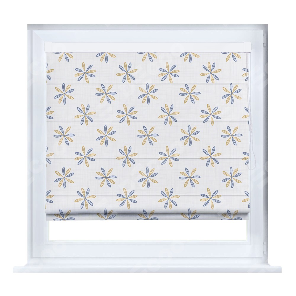 Римская штора кассетного типа, производителя «Cortin», устанавливается только на пластиковые окна и прилегает к стеклопакету, пошита из ткани блэкаут с нанесением сублимационной печати «Ромашки кантри».