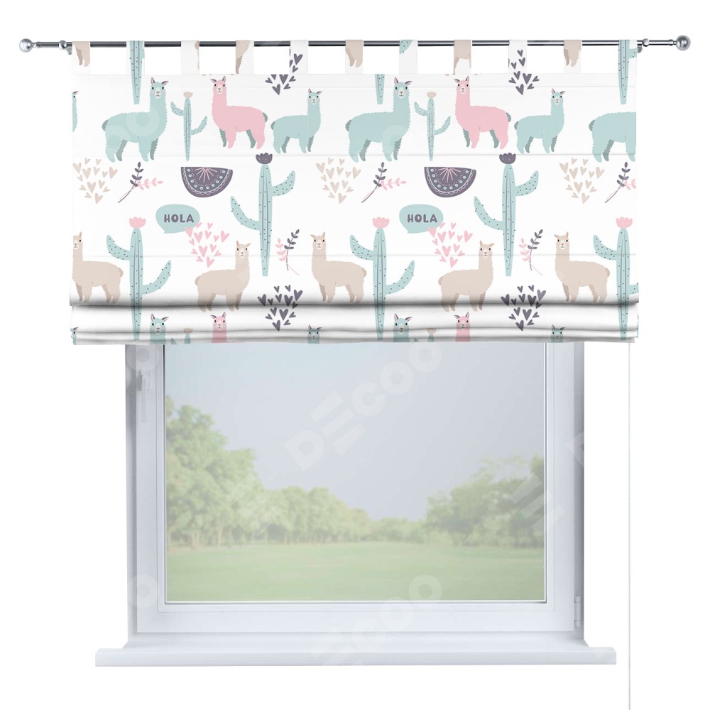 Римская штора производителя «Cortin», используется для проёма, пошита из ткани блэкаут с нанесением сублимационной печати «Милый лама». Данная модель пошита на петлях, комплектуется на выбор круглым карнизом и подходит для монтажа на стену. Римская штора на петлях имеет простую систему регулировки высоты, отличительным преимуществом данной модели является простой способ монтажа. Достаточно повесить ее на трубу и штора готова!