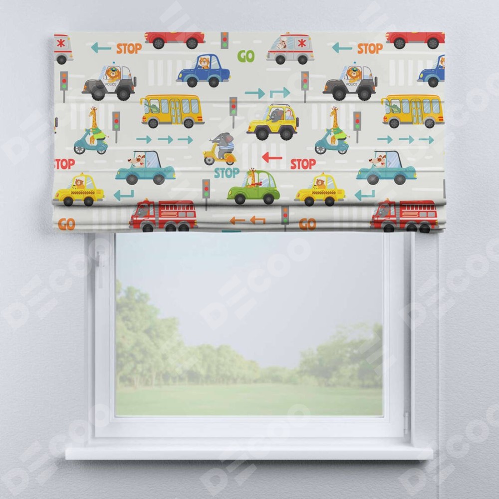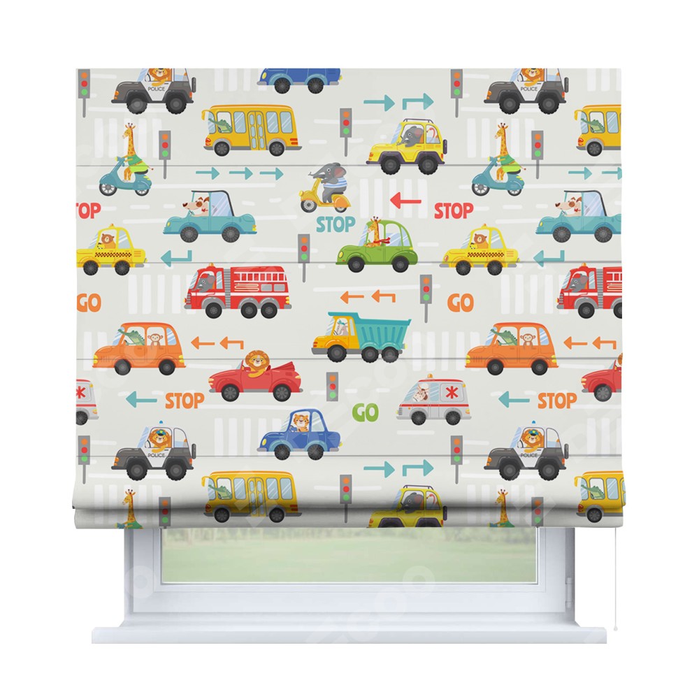 Римская штора производителя «Cortin», используется для проёма, пошита из ткани блэкаут с нанесением сублимационной печати «Дорожные правила». Имеет универсальный механизм и подходит для монтажа: на потолок, на стену и в нишу.