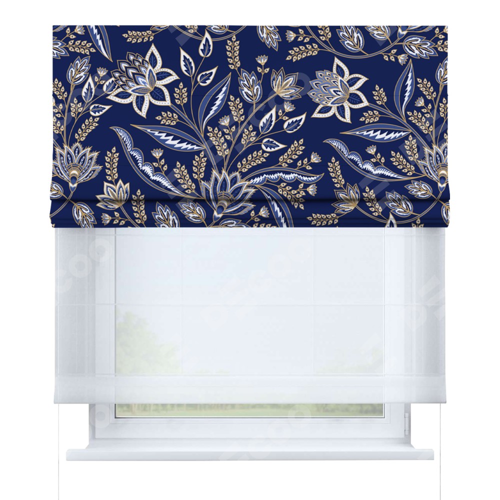 Римская штора день-ночь производителя «Cortin», используется для проёма, пошита из двух полотен, с лицевой блэкаут с нанесением сублимационной печати «Индиго батик», вторая ткань тюль (по стандарту комплектуется тюль белого цвета артикул V-01). Имеет универсальный механизм и подходит для монтажа: на потолок, на стену и в нишу.