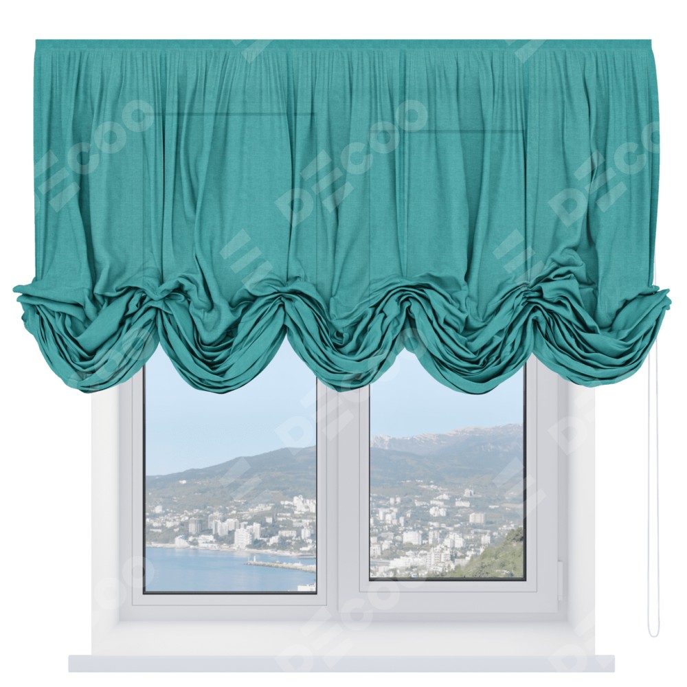 Австрийская штора производителя «Cortin», используется для проёма, пошита из ткани лён изумрудный, артикул ткани 85908. Имеет универсальный механизм и подходит для монтажа: на потолок и на стену.