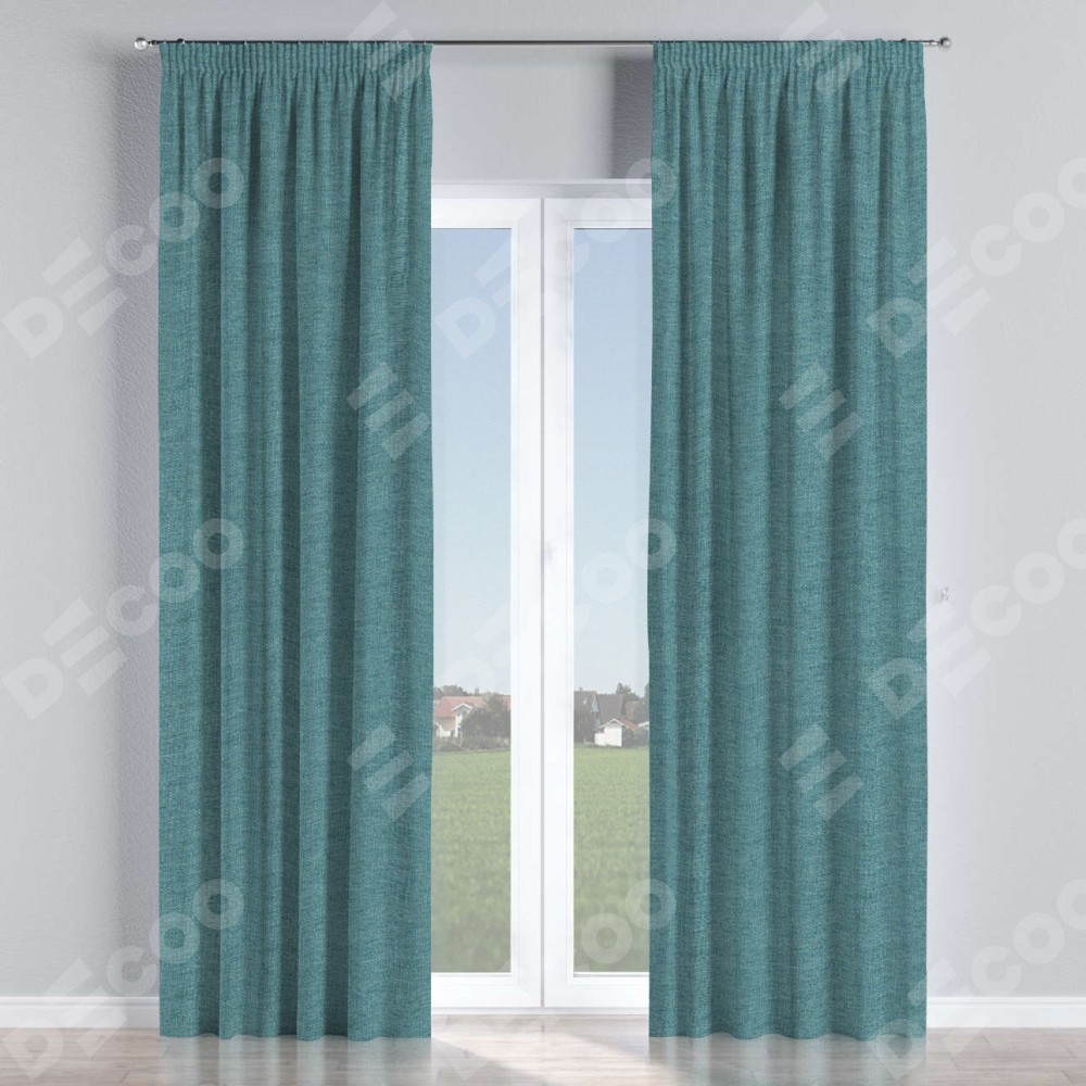Комплект прямых штор, от производителя «Cortin», пошиты из ткани стиф димаут бирюзовый, артикул ткани 18196. С изнаночной стороны в верхней части штор пристрачивается шторная лента с декоративными складками «Карандаш». Для создания элегантных складок прямые шторы шьются по стандарту с коэффициентом 1:2 (на 100 см. ширины проёма 200 см. ширины ткани).