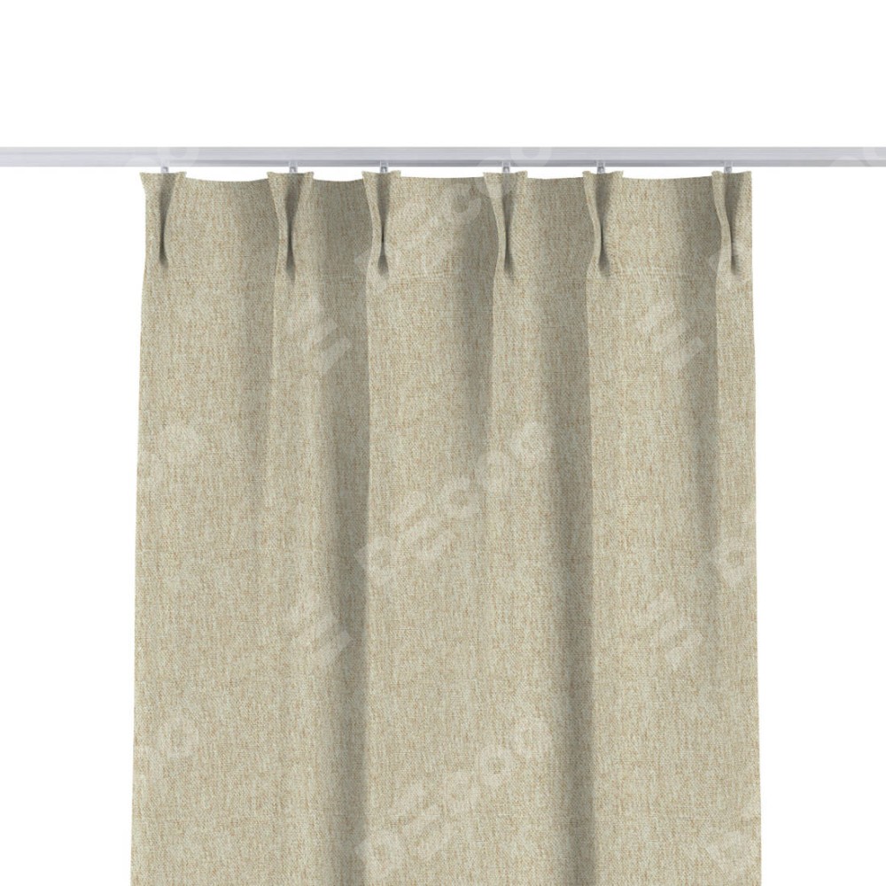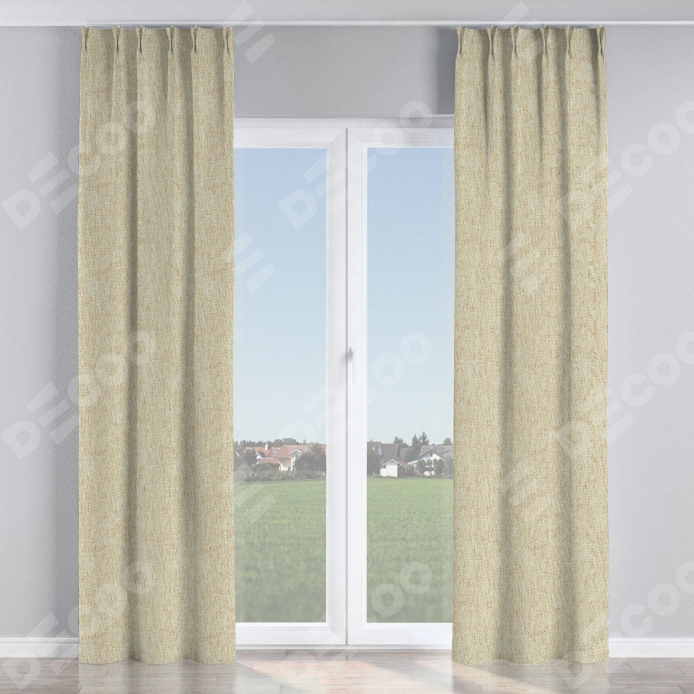 Комплект прямых штор, от производителя «Cortin», пошиты из ткани стиф димаут светло-бежевый, артикул ткани 18084. С изнаночной стороны в верхней части штор пристрачивается шторная лента с декоративными складками «Кустик». Для создания элегантных складок прямые шторы шьются по стандарту с коэффициентом 1:2 (на 100 см. ширины проёма 200 см. ширины ткани).