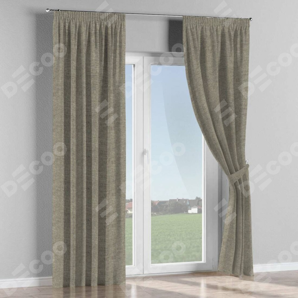 Комплект прямых штор, от производителя «Cortin», пошиты из ткани стиф димаут серо-коричневый, артикул ткани 44028. С изнаночной стороны в верхней части штор пристрачивается шторная лента с декоративными складками «Карандаш». Для создания элегантных складок прямые шторы шьются по стандарту с коэффициентом 1:2 (на 100 см. ширины проёма 200 см. ширины ткани).