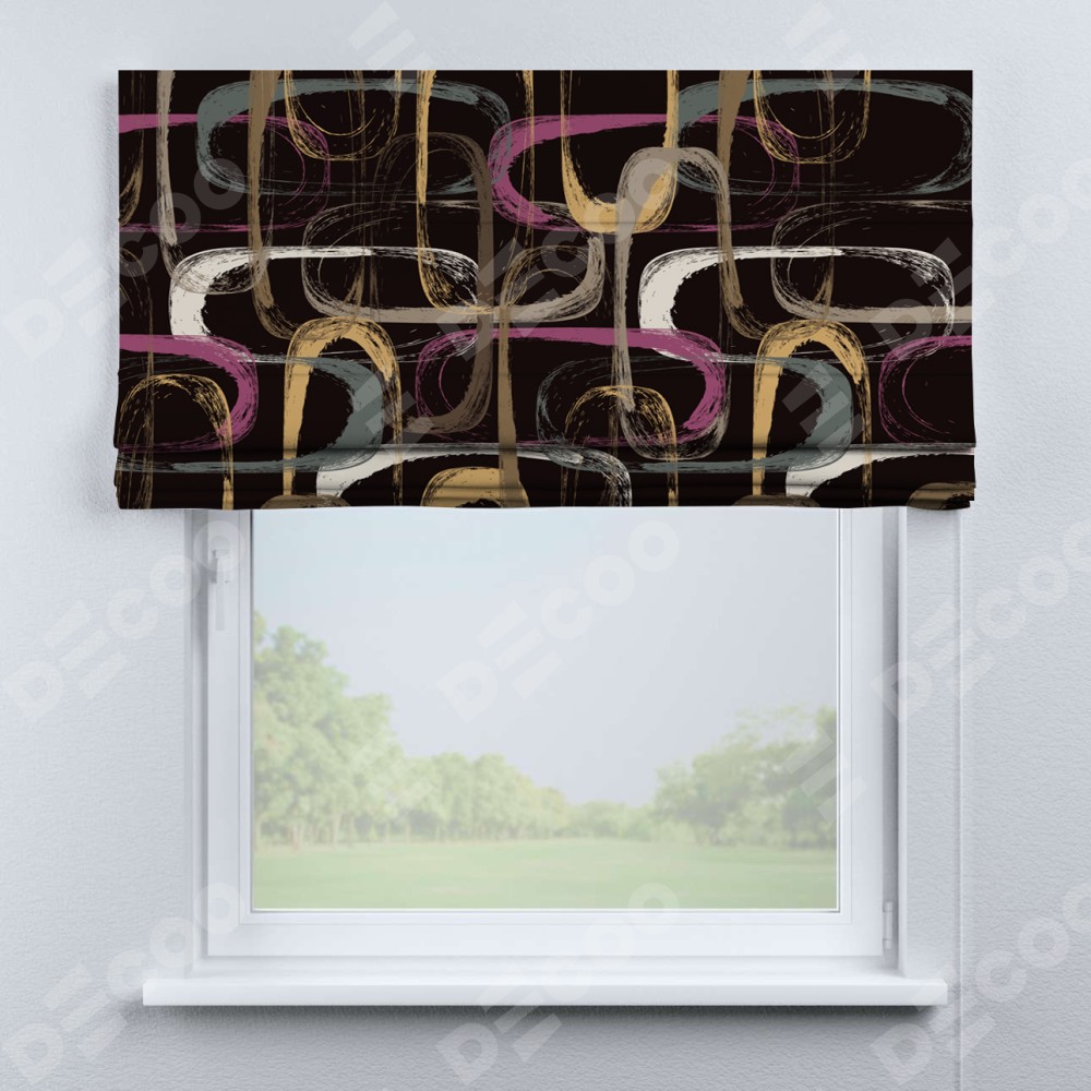 Римская штора производителя «Cortin», используется для проёма, пошита из ткани блэкаут с нанесением сублимационной печати «Тёмная палитра». Имеет универсальный механизм и подходит для монтажа: на потолок, на стену и в нишу.