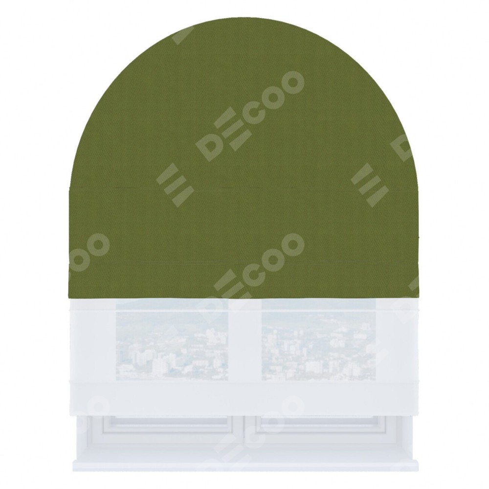 Римская штора день-ночь производителя «Cortin», используется для арочного проёма, пошита из двух полотен, с лицевой стороны блэкаут однотонный оливковый артикул 81859−1, вторая ткань тюль (по стандарту комплектуется тюль белого цвета артикул V-01). Штора шьётся по индивидуальным размерам, для данного типа римской шторы возможная ширина от 60 до 300 см. Удобное управление каждой шторой отдельно.