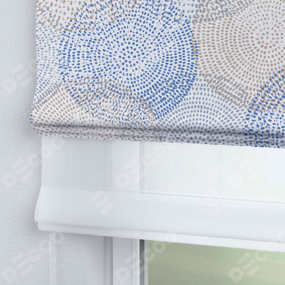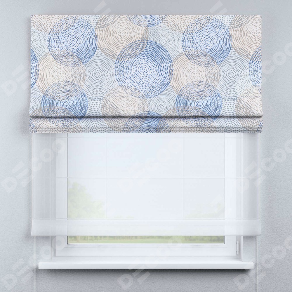 Римская штора день-ночь производителя «Cortin», используется для проёма, пошита из двух полотен, с лицевой блэкаут с нанесением сублимационной печати «Абстрактные круги», вторая ткань тюль (по стандарту комплектуется тюль белого цвета артикул V-01). Имеет универсальный механизм и подходит для монтажа: на потолок, на стену и в нишу.