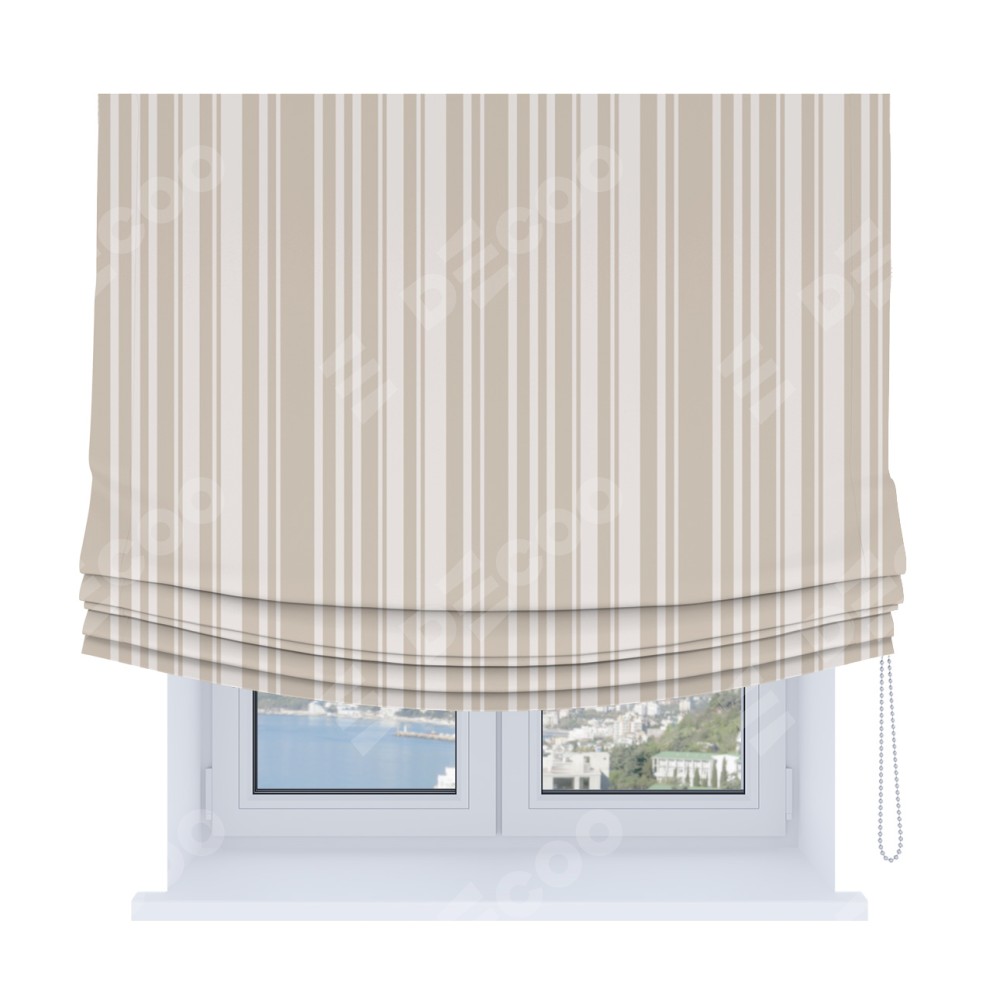 Римская штора Soft производителя «Cortin», используется для проёма, пошита из ткани блэкаут с нанесением сублимационной печати «Бежевые вертикальные полоски». Имеет универсальный механизм и подходит для монтажа: на потолок, на стену и в нишу. В отличие от стандартных римских штор, римская штора Soft не имеет горизонтальных вставок и нижнего отвеса. Это позволяет ткани произвольно драпироваться в свободные мягкие складки.