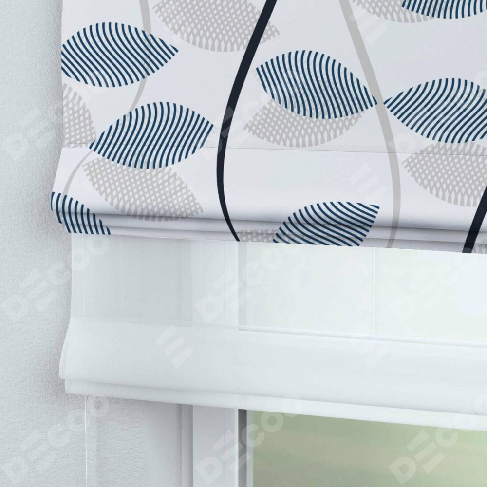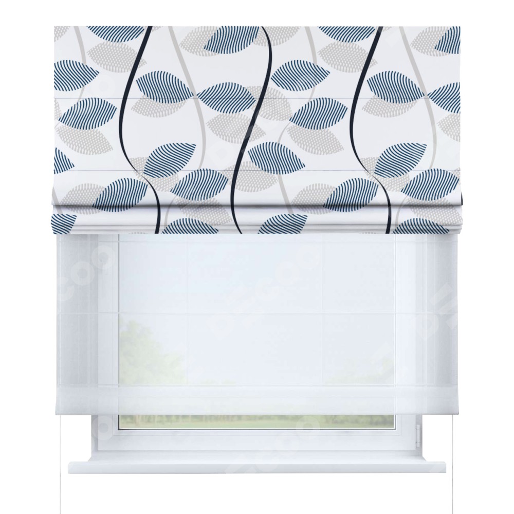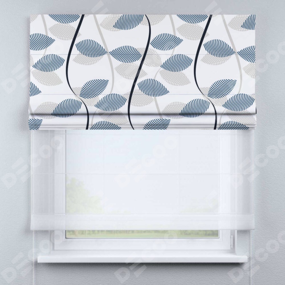 Римская штора день-ночь производителя «Cortin», используется для проёма, пошита из двух полотен, с лицевой блэкаут с нанесением сублимационной печати «Резные листья», вторая ткань тюль (по стандарту комплектуется тюль белого цвета артикул V-01). Имеет универсальный механизм и подходит для монтажа: на потолок, на стену и в нишу.