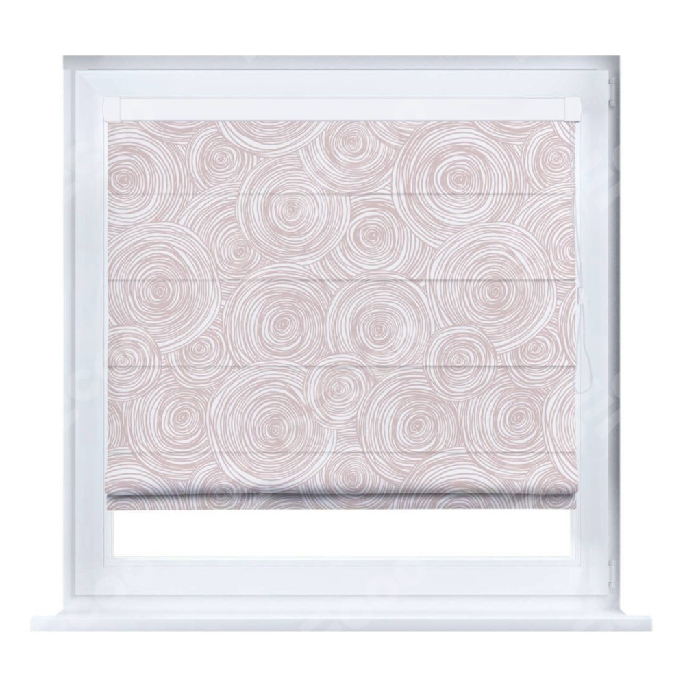 Римская штора производителя «Cortin», устанавливается на створку окна, пошита из ткани блэкаут с нанесением сублимационной печати «Бежевые круги». Штора шьётся по индивидуальным размерам, для данного типа римской шторы возможная ширина от 35 до 150 см., высота до 250 см.
