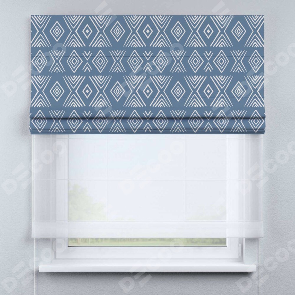 Римская штора день-ночь производителя «Cortin», используется для проёма, пошита из двух полотен, с лицевой блэкаут с нанесением сублимационной печати «Графический орнамент», вторая ткань тюль (по стандарту комплектуется тюль белого цвета артикул V-01). Имеет универсальный механизм и подходит для монтажа: на потолок, на стену и в нишу.