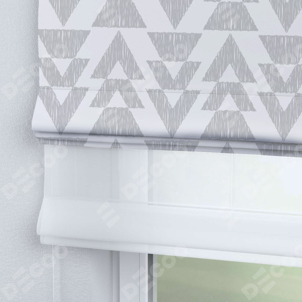 Римская штора день-ночь производителя «Cortin», используется для проёма, пошита из двух полотен, с лицевой блэкаут с нанесением сублимационной печати «Серые стрелки», вторая ткань тюль (по стандарту комплектуется тюль белого цвета артикул V-01). Имеет универсальный механизм и подходит для монтажа: на потолок, на стену и в нишу.